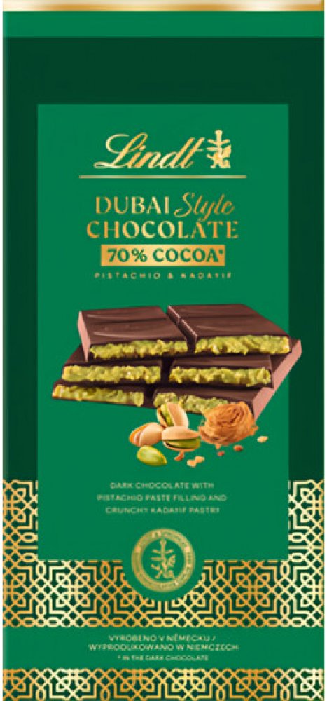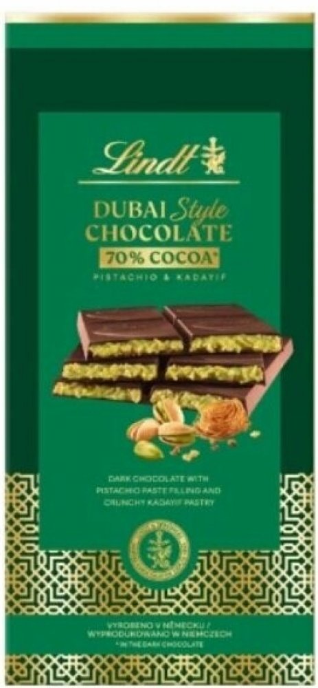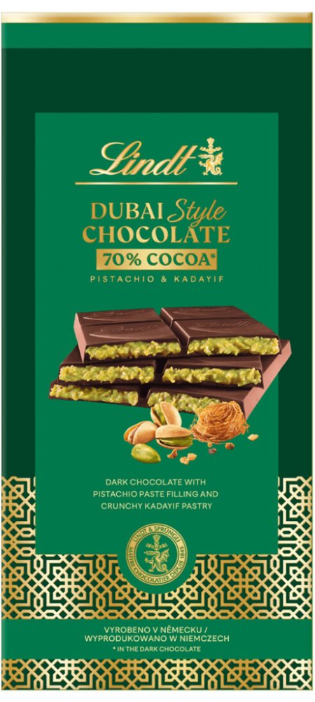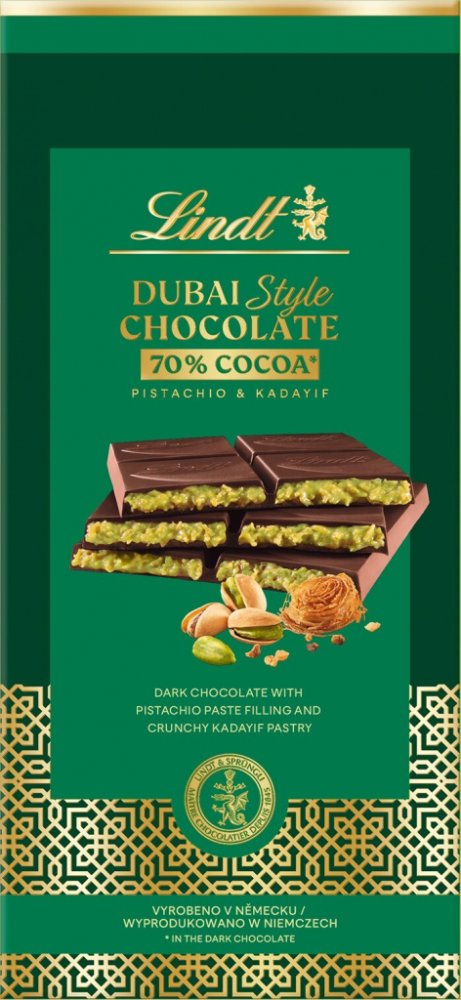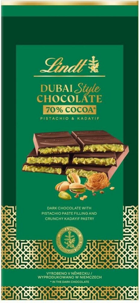 Dubajská hořká čokoláda s pistáciemi LINDT145 g Překvapí svojí chutíDubajská čokoláda LINDT Dubai Style Chocolate potěší všechny milovníky hořké čokolády a pistácií. Obsahuje pistáciovo-cukrářskou náplň, jejíž součástí je 45 % pistácií a cukrářské nitě. Nabízí minimálně 70 % kakaové sušiny. Dubajská hořká čokoláda s pistáciemi LINDT vyniká originální chutí, kterou vás překvapí. Klíčové vlastnosti ...