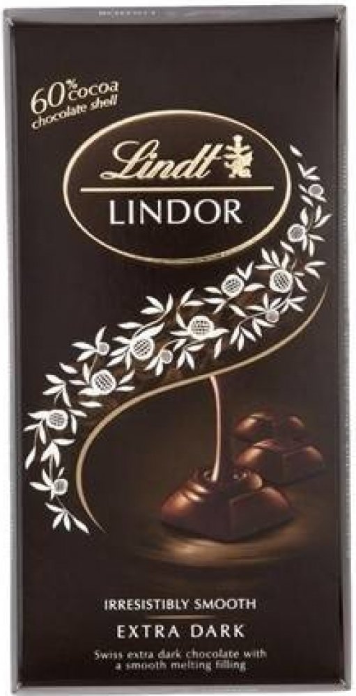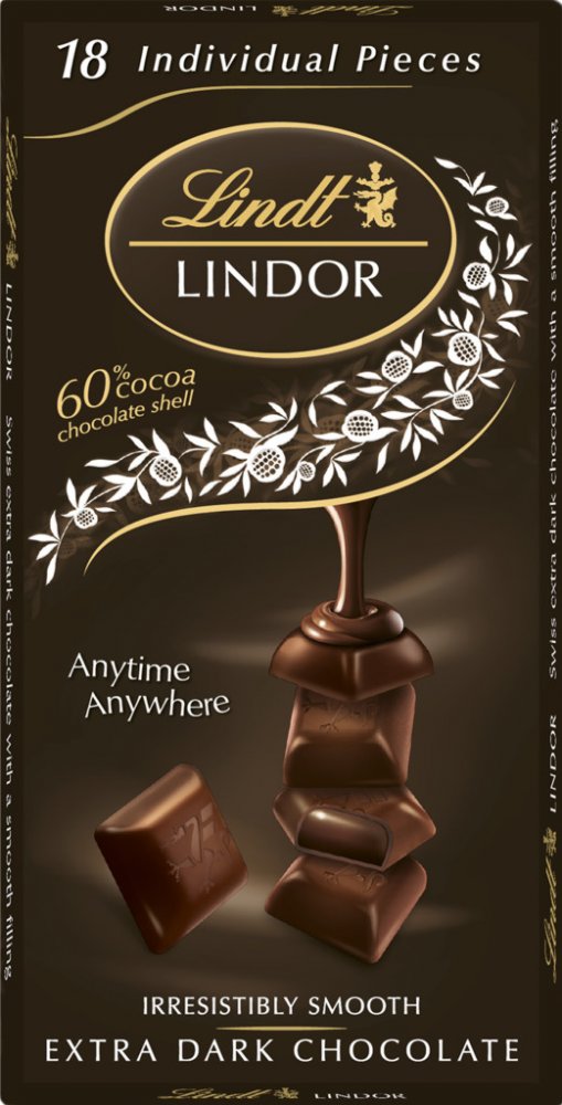 Extra hořká čokoláda s jemnou náplní (44%). Balení obsahuje 18 individuálních porcí-