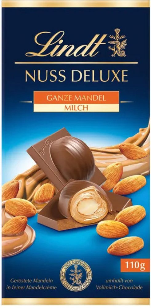 Plnotučná mléčná čokoláda plněná mandlovým krémem (24%) a celými mandlemi ( 6%)