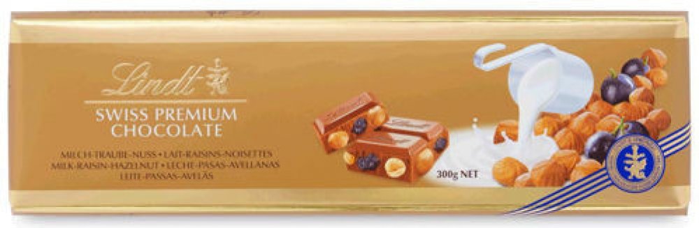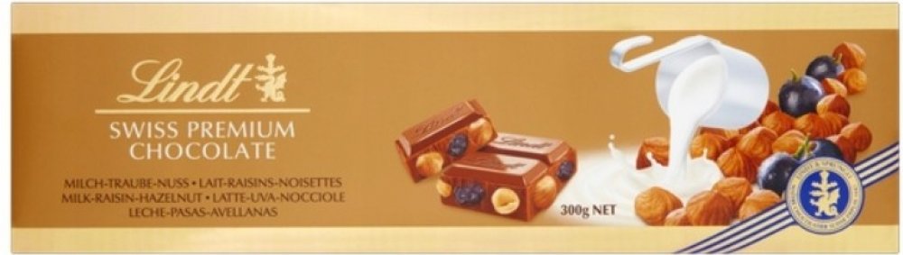 Lindt Swiss Premium Chocolate mléčná čokoláda s rozinkami, celými lískovými oříšky 300 g