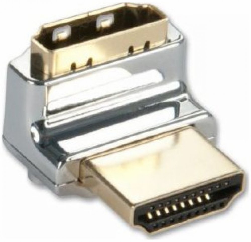 HDMI redukce lomená o 90° nahoru.; Použití: Tam kde není dostatek místa za přístrojem pro přímý kabel HDMI.; Konektory: HDMI A(M) - HDMI A(F); Zapojení: 1 : 1; Barva: stříbrná; Rozměry: 22 x 20 x 15mm (hloubka x šířka x výška); Druh obalu: PE sáček s eurovýsekem; Hmotnost výrobku: 10g