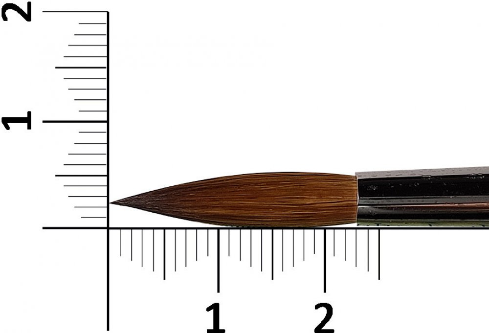 Kulatý štětec ze 100% přírodního vlasu sobola, známé pod jménem Kolinsky, bezešvé niklové kování. Kratká lakovaná rukojeť.