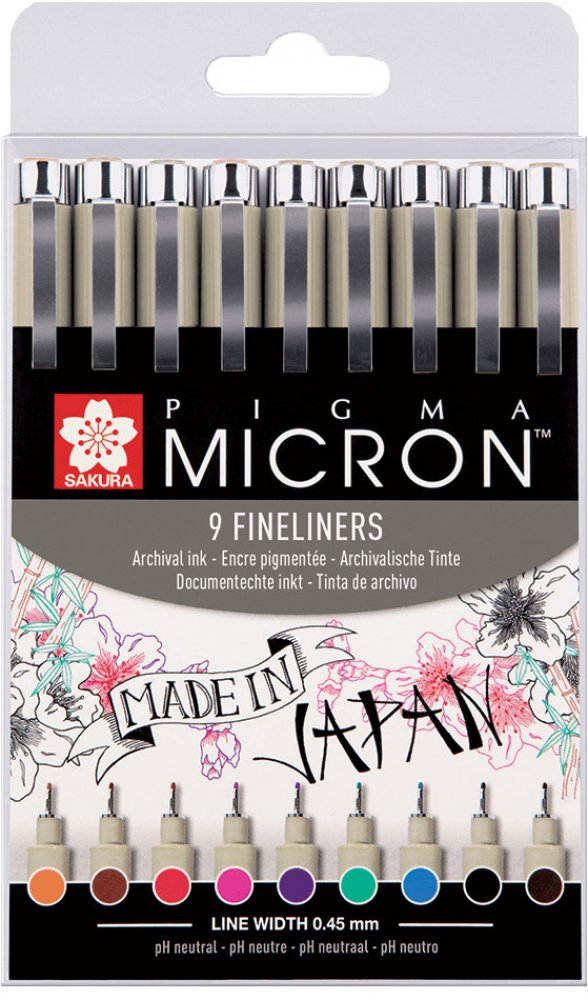 Sada linerů Sakura v kombinaci barev. Skvělé pro Bullet journal, technické kreslení, ilustrace, skicování a další. Liner je také vhodný pro práci s pravítkem a šablonami, díky dlouhému kovovému hrotu. Šířka stopy 0,45 mmBarvy v balení: oranžová, světle hnědá, červená, růžová, fialová, zelená, modrá, černá, tmavě hnědáNepropíjí většinu běžných papírůInkoust na bázi vody a pigmentu, bez zápachuVhodné na: karton, hedvábí, omítku, dřevo, všechny porézní povrchyRychleschnoucí, odolný vůči vodě, chemikáliím, nevybledáváArchivní stálost