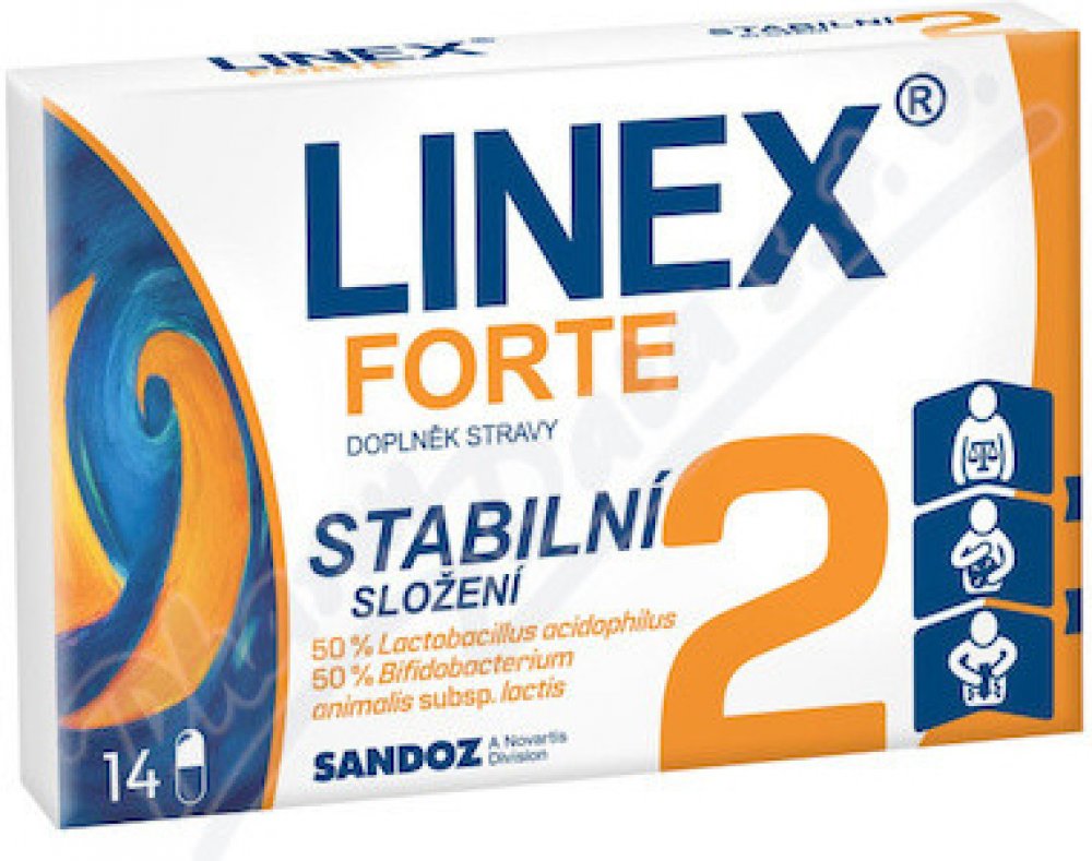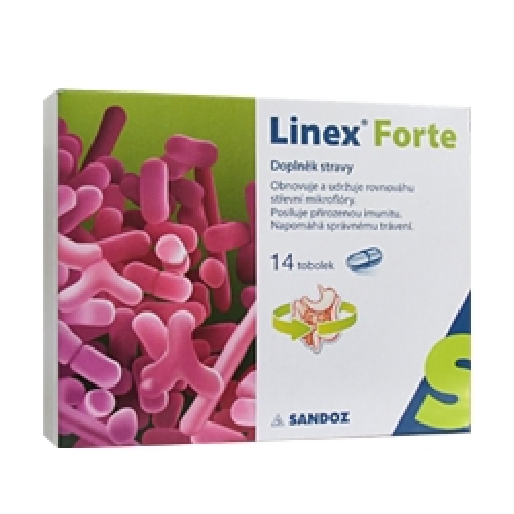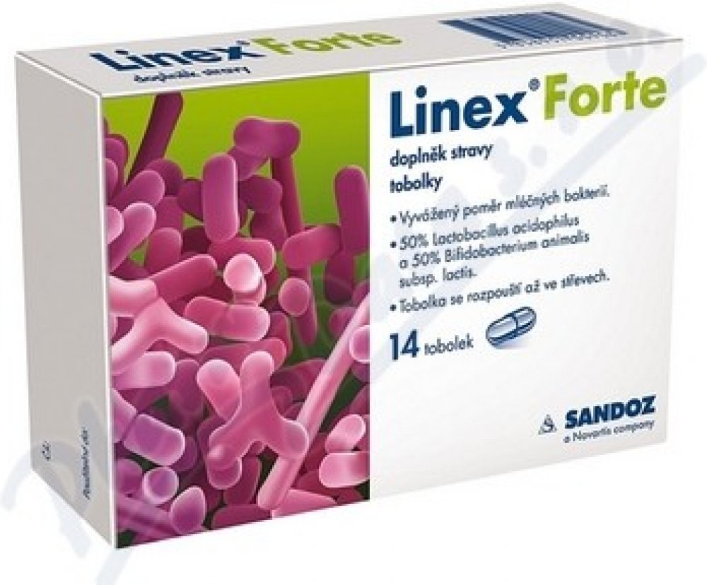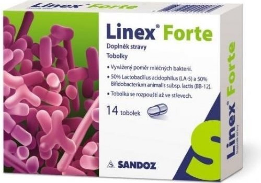 Linex obsahuje bakterie Lactobacilus acidophilus a Bifidobacterium animalis lactis. Obnovuje a udržuje rovnováhu střevní míkroflóry. Napomáhá správnému trávení. Posiluje přirozenou imunitu organismu. Charakteristika: Linex Forte obsahuje živé mikroorganismy, které pomáhají udržovat zdravou střevní mikroflóru a má pozitivní účinky při průjmových obtížích způsobených její nerovnováhou.Každá tobolka Linex Forte obsahuje vyváženou kombinaci probiotik a prebiotik. Probiotika - živé mikroorganismy vyskytující se v tenkém a tlustém střevě. Pomáhají udržovat zdravou rovnováhu střevní míkroflóry a kontroluji růst nežádoucích střevních mikroorganismů. 2 kmeny účinných živých mikroorganismů prospěšných pro zdravé trávící ústrojí: Lactobacilus acidophilus (LA-5) a Bifidobacterium animalis lactis (BB-12). Prebiotika - nestravitelné látky, které příznivě ovlivňují růst a aktivitu pozitivně působících bakterií potřebných pro zdravou střevní mikroflóru. Zdroj živin pro pozitivně působící živé mikroorganismy: Inulin a Oligosacharidy. Balení: 14 cps.