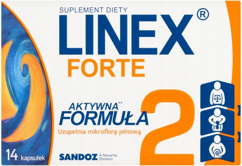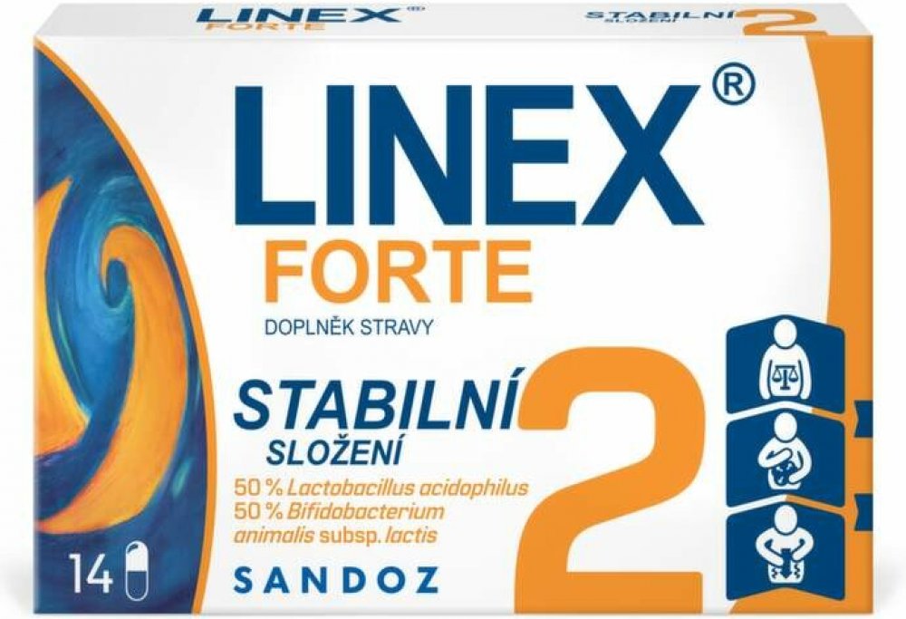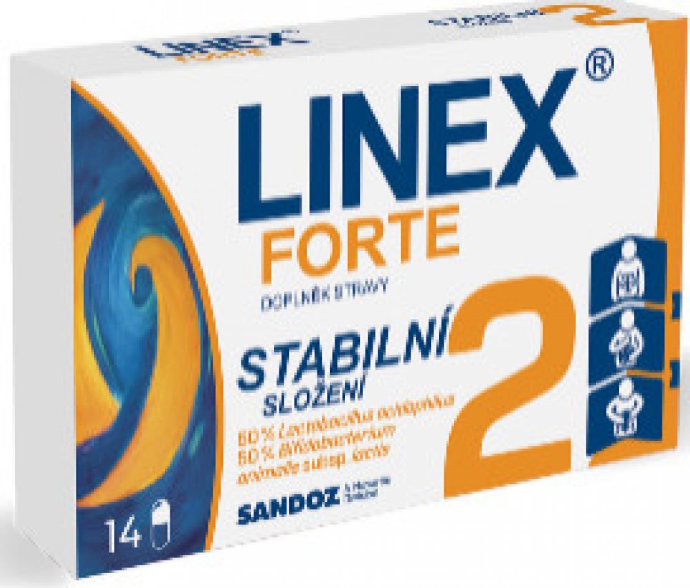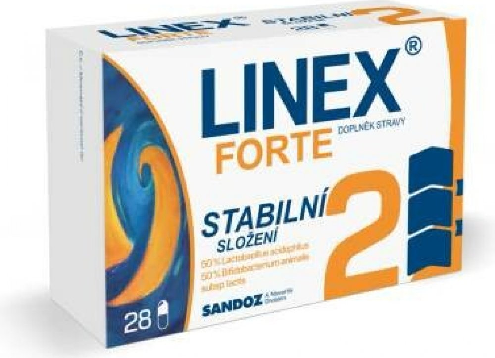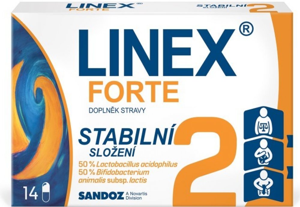 Linex obsahuje bakterie Lactobacilus acidophilus a Bifidobacterium animalis lactis. Obnovuje a udržuje rovnováhu střevní míkroflóry. Napomáhá správnému trávení. Posiluje přirozenou imunitu organismu. Charakteristika: Linex Forte obsahuje živé mikroorganismy, které pomáhají udržovat zdravou střevní mikroflóru a má pozitivní účinky při průjmových obtížích způsobených její nerovnováhou.Každá tobolka Linex Forte obsahuje vyváženou kombinaci probiotik a prebiotik. Probiotika - živé mikroorganismy vyskytující se v tenkém a tlustém střevě. Pomáhají udržovat zdravou rovnováhu střevní míkroflóry a kontroluji růst nežádoucích střevních mikroorganismů. 2 kmeny účinných živých mikroorganismů prospěšných pro zdravé trávící ústrojí: Lactobacilus acidophilus (LA-5) a Bifidobacterium animalis lactis (BB-12). Prebiotika - nestravitelné látky, které příznivě ovlivňují růst a aktivitu pozitivně působících bakterií potřebných pro zdravou střevní mikroflóru. Zdroj živin pro pozitivně působící živé mikroorganismy: Inulin a Oligosacharidy. Balení: 14 cps.