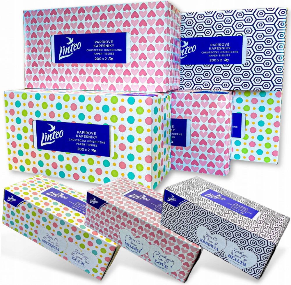 Papírové kapesníky je vždy dobré mít při ruce, ať už máte rýmu nebo si jen chcete utřít ruce. Kapesníky od značky LINTEO jsou ukryty do praktického boxu s veselým barevným motivem, díky kterému může box s kapesníky sloužit i jako hezký doplněk v bytě či v kanceláři. Jemné bílé kapesníky LINTEO jsou dvouvrstvé, zajistí vám tak měkkost, jemnost, ale i pevnost. V boxu najdete 200 ks kapesníků.