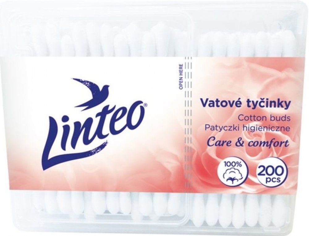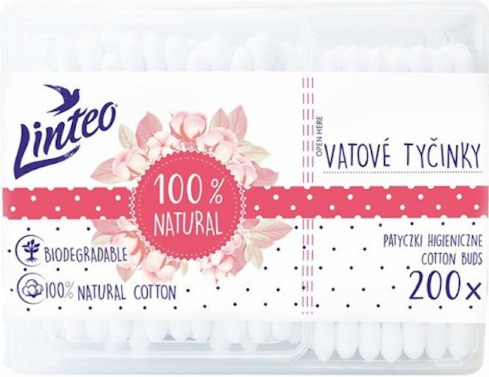 Vatové tyčinky Linteo jsou vyrobeny ze 100% bavlny a plastu.