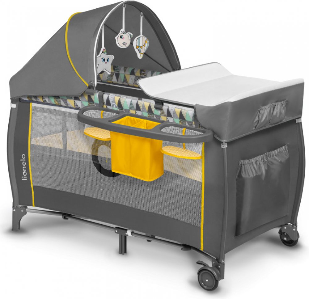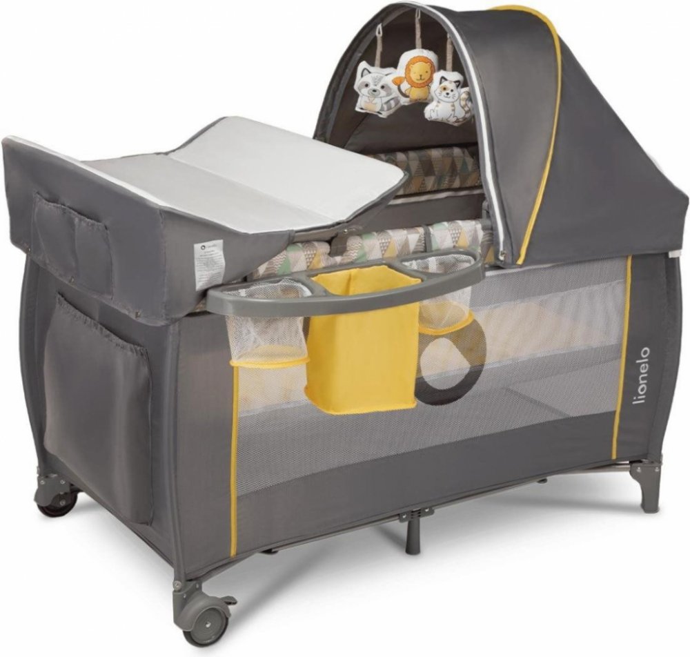 Vlastnosti a funkce: Součástí je velká moskytiéra a hrazdička s plyšovými hračkami a stříškou. Přebalovací pult s bočními kapsami (na pleny, pudr apod.). Košík na příslušenství se dvěma přihrádkami. Součástí je cestovní skládací matrace, kterou je možné použít i do vložného lůžka (rozměr 120x60 cm). Vložné lůžko je také součástí balení. Nabízí funkci houpání – součástí jsou dvě zaoblené nohy, díky kterým se postýlka houpe. Praktická, odnímatelná taška na drobnosti. Boční uzavíratelný vchod, držadla pro dítě na postavení. Vak na přenášení složené postýlky je součástí balení. Součástí je hudební centrum se světýlkem a vibracemi. Cestovní postýlka je v souladu s normou EN 716-1. Nosnost: 15 kg Rozměry: 125x65x77 cm