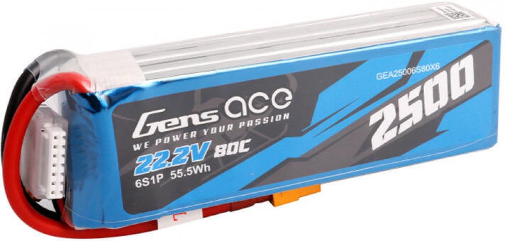 Gens ace 2500mAh 22.2V 80C 6S1P Lipo battery with XT60 plug connector.