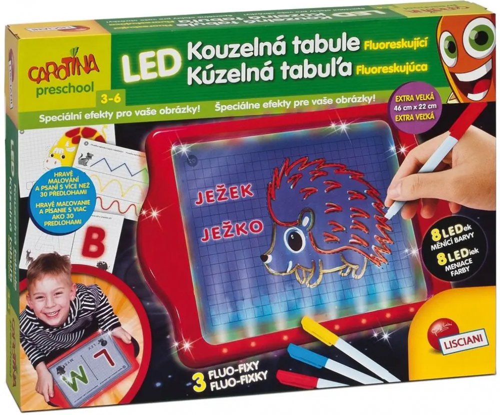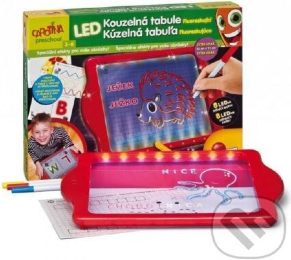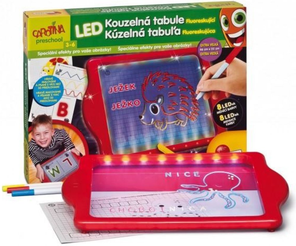 Kouzelná tabulka LED z naučné série PRESCHOOL! Fluoreskující záře vašich obrázků, písmen a slov vás přivede k úžasu! S LED Kouzelnou tabulkou a FLUO-fixy se můžete pořádně vyřádit a popustit uzdu své fantazii! Kromě toho se s pomocí předloh k malování a psaní učíte hravou formou. tabulka má 8 různých režimů podsvícení. Balení obsahuje – houbičku na mazání, 3 fluo fixy, podpěry a šablony.