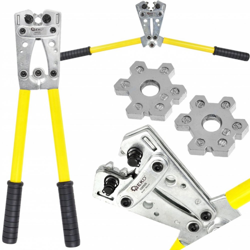 Lisovací (krimpovací) kleště GEKO G00920 jsou profesionální nástroj určený pro spojování kabelů a kabelových ok v rozsahu 6 až 50 mm². Jsou vyrobeny z odolné tvrzené oceli SCM-40, což zajišťuje dlouhou životnost a spolehlivost i při intenzivním používání. Díky speciálnímu pákovému systému dokáže nástroj vyvinout tlak až 8 tun, a to při vynaložení minimální síly. Ergonomická rukojeť s protiskluzovým povrchem zvyšuje komfort a bezpečnost při práci.