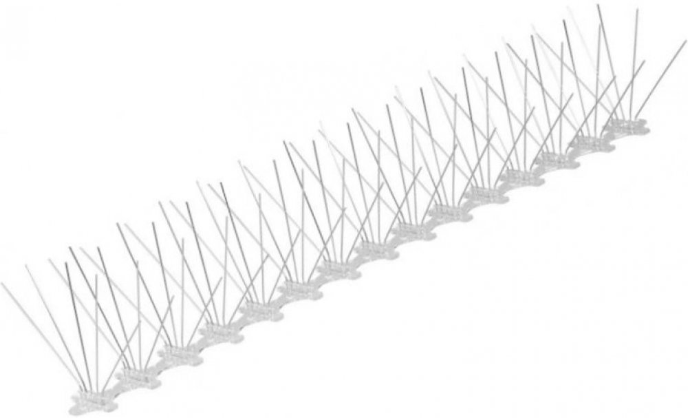 Lišta s hroty proti ptákům 5řadá Ochrana před sedáním holubů a jiných ptáků na okenní parapety, balkony, římsy, střechy apod. 5 řad s celkem 75 robustními hroty odolnými vůči korozi hroty z odolné nerezové inox oceli pro dlouhou životnost v exteriéru základna (pásek) z odolného polykarbonátu s ochranou proti UV záření rozměry: 60 x 11 cm průměr hrotu: 1,3 mm