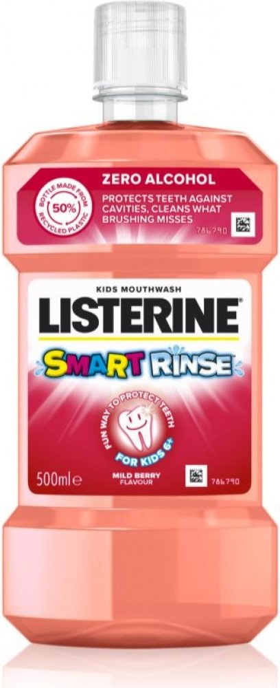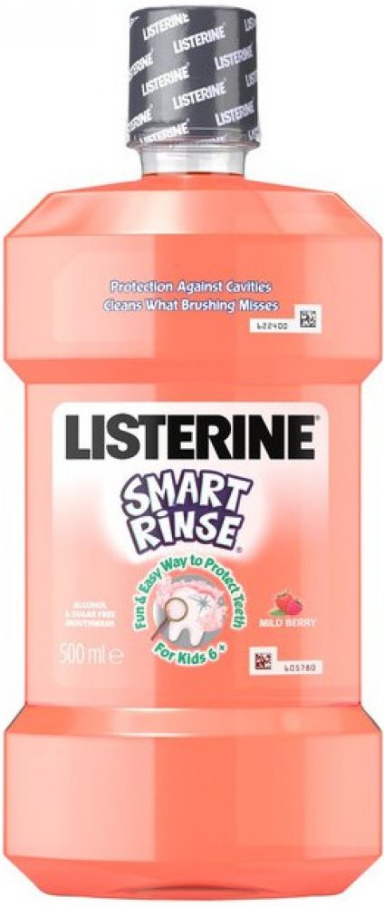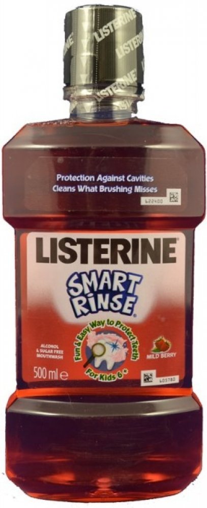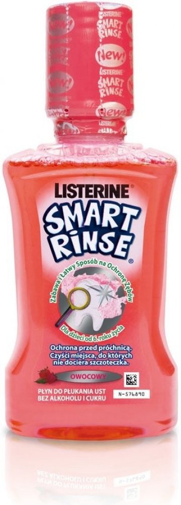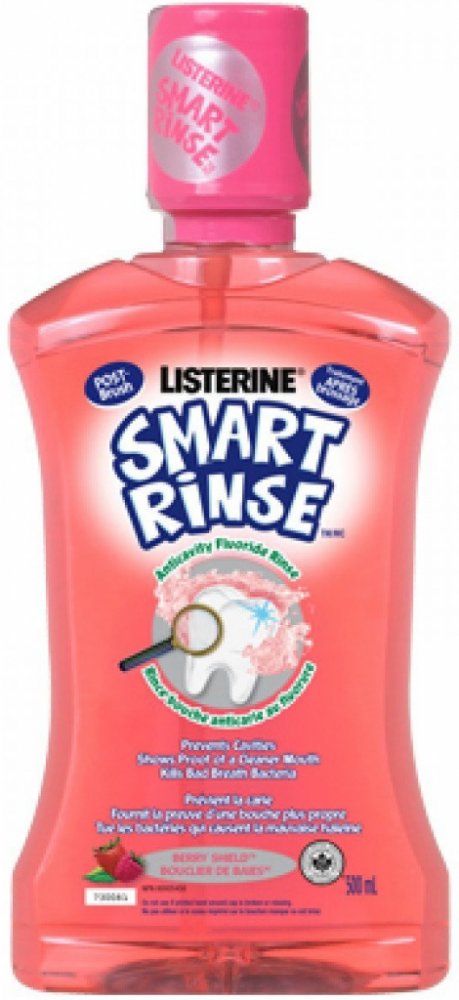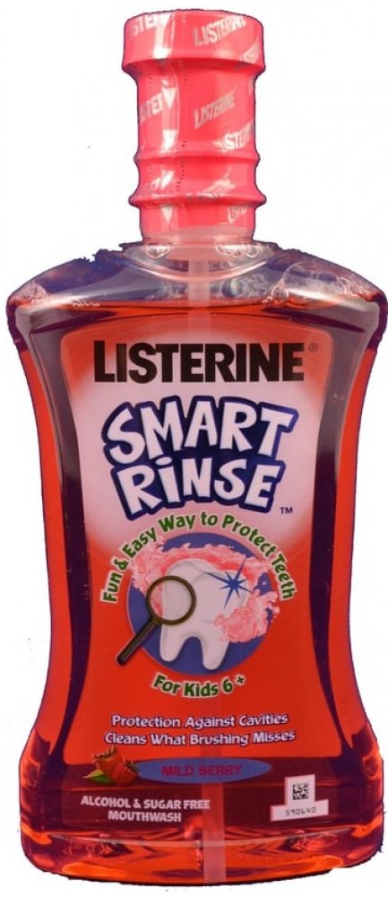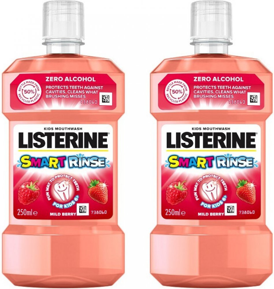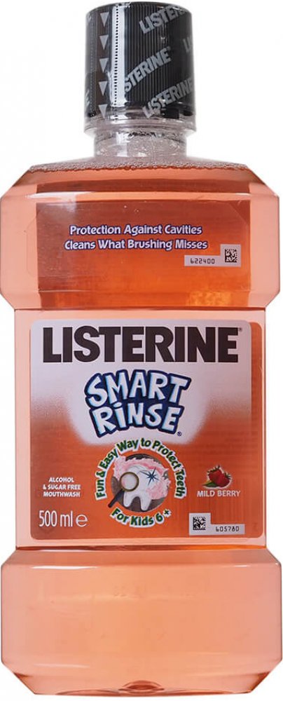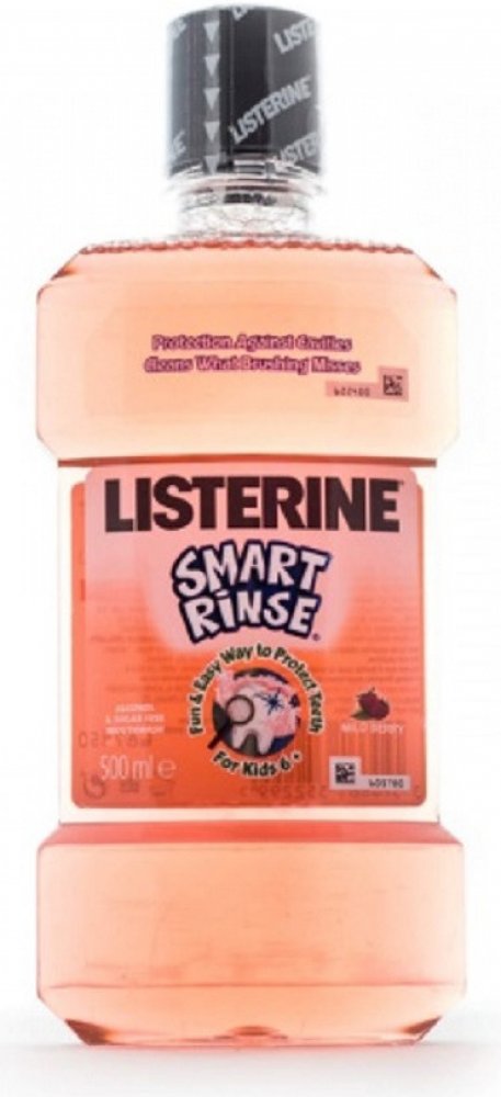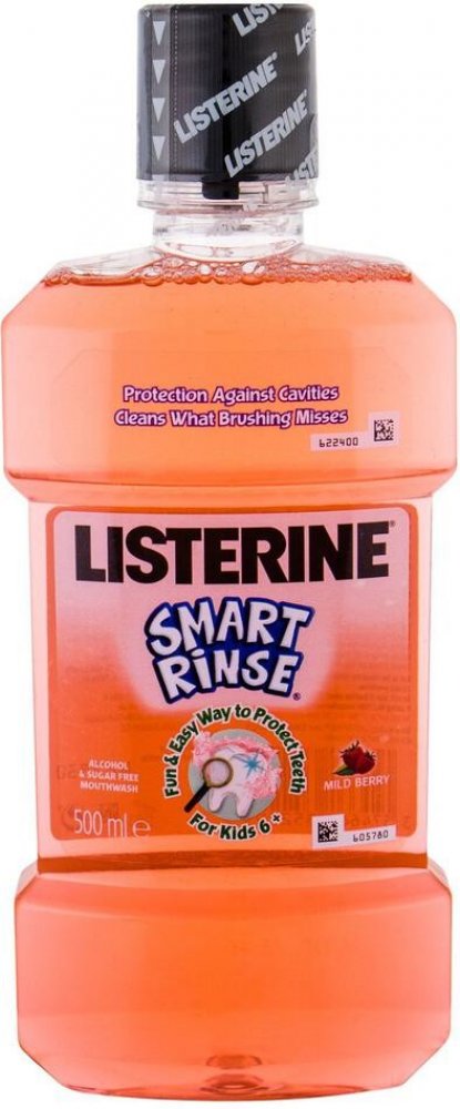 Ústní voda pro děti Listerine Smart Rinse Mild Berry obsahuje množství fluoridu optimální pro dětské zuby. Pomáhá chránit zuby Vašeho dítěte před zubním kazem při používání dvakrát denně po vyčištění zubů kartáčkem. Obsahuje fluorid, který posiluje zuby a snižuje riziko zubního kazu až o 40% více než samotné čištění zubů. (Obsah fluoridu sodného 0,022% w/v 100 ppm F). Ničí škodlivé bakterie, hlavní příčinu vzniku zubního povlaku a onemocnění dásní. Působí v celých ústech, na zubech, dásních a jazyce. Přitahuje a zbarvuje částečky, které kartáček opomene, a ukazuje tak Vašemu dítěti důkaz v umyvadle. Použití: ústní voda se používá dvakrát denně po vyčištění zubů. Odstraňte uzávěr a stisknutím lahve naplňte po rysku 10 ml. Obsah přelijte do skleničky. Dítě si proplachuje ústa přibližně 60 vteřin a poté obsah vyplivne. Dohlédněte, aby Vaše dítě ústní vodu nepolykalo.