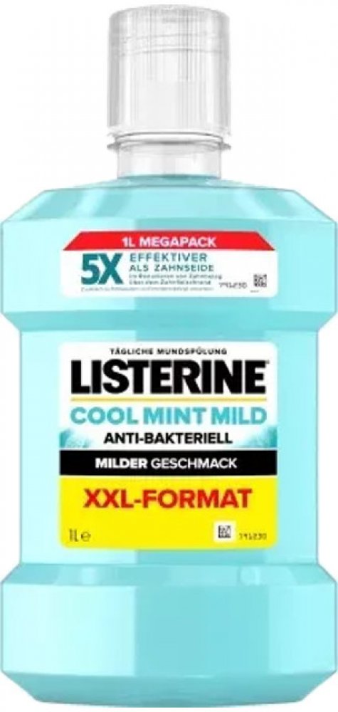 Listerine® Cool Mint Mild Taste s jemnější příchutí, poskytuje při používání dvakrát denně 24 hodinovou ochranu proti zubnímu povlaku a udržuje svěží dech. Je klinicky prokázáno, že Listerine® Cool Mint: chrání před zubním povlakem, hlavní příčinou onemocnění dásní, a snižuje jeho obsah, ničí bakterie v mezizubním prostoru, osvěžuje dech. Návod k použití: Přípravek je obzvláště účinný při používání ráno a večer po vyčištění zubů. Odměřte 20 ml (4x5 ml - 4 čajové lžičky) do skleničky, proplachujte prostor kolem zubů a dásní po 30 vteřin a poté vyplivněte. Otevření: Stiskněte uzávěr na hladkých plochách a otočte jím. Uzavření: Otáčejte uzávěrem do úplného uzavření.