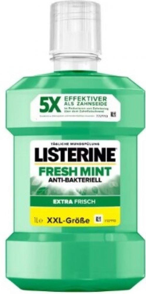 Ústní voda Listerine Fresh Mint 1000 ml s esenciálními oleji účinně ničí bakterie, které způsobují zápach z úst, plak a zánět dásní. Poskytuje dlouhotrvající svěží dech a podporuje zdraví ústní dutiny.