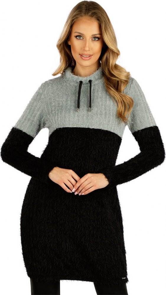Stoják s průchodkami a tkanicí se stříbrnými koncovkami. Délka šatů s nabráním do gumy. Volný střih. Originální vzhled pleteniny s plastickým vzorem a hebkým, příjemným omakem. Délka šatů cca 85 cm.