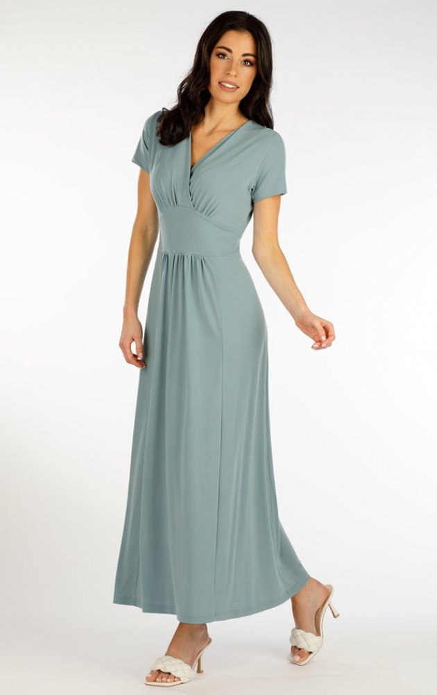 Elegantní dámské šaty s hlubokým výstřihem a tvarovaným pružným páskem pod prsy pro zvýraznění ženské siluety. Spodní díl šatů nařasený pro pohodlné nošení. Velmi splývavý a pružný nemačkavý materiál Vám zajistí maximálně příjemný pocit při nošení. lehký a příjemný materiál pružný pásek pod prsy hluboký výstřih délka šatů cca 140cm