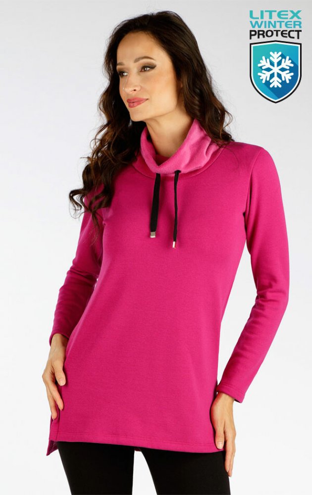 Vysoký spadlý stoják s průchodkami a černou tkanicí s ozdobnými koncovkami. Delší zadní díl. Na bocích rozparky. Mikinový úplet s vnitřním vyšším počesem je velmi teplý a příjemný na těle. Díky bavlně a elastanu je krásně měkký a pružný. Velmi pěkná zářivá barva. Délka tuniky cca 75 cm.