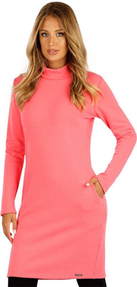 Dámské mikinové šaty. Přiléhavý střih. Stoják. Praktické boční kapsy. Mikinový úplet s vnitřním vyšším počesem je velmi teplý a příjemný na těle. Díky bavlně a elastanu je krásně měkký a pružný. Velmi pěkná zářivá barva. Délka šatů cca 90 cm.