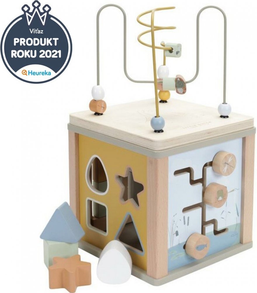 Hrací krychle je kvalitní multifunkční dřevěná hračka, která rozvíjí dětskou koncentraci, představivost a motoriku. Na kostce najdete vkládačku tvarů, otočná ozubená kolečka, bludiště, otáčecí kostky s obrázky a spirálu s dřevěnými korálky. Víko kostky, na kterém je umístěná spirála, lze zvednout pro vyjmutí kostek. Když si dítě dohraje, jednoduše může otočit stranu se spirálou dovnitř a kostka ta...