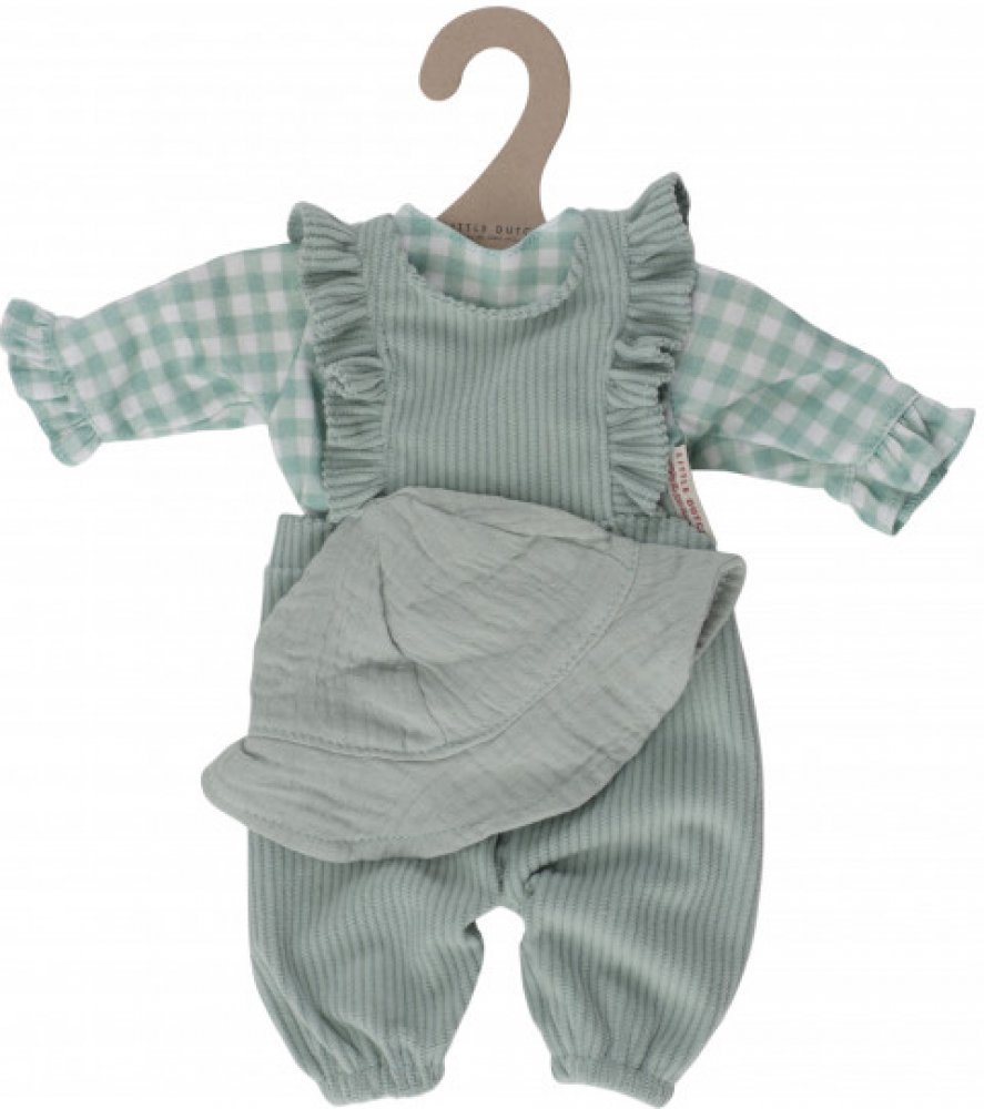 Krásná sada oblečení pro panenku Little Dutch Baby obsahuje overal s dlouhými kalhotami a všitým kostkovaným body s dlouhým rukávem a klobouček. Vhodné pro děti od 18 měsíců.