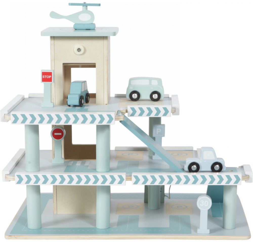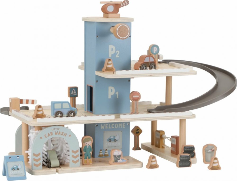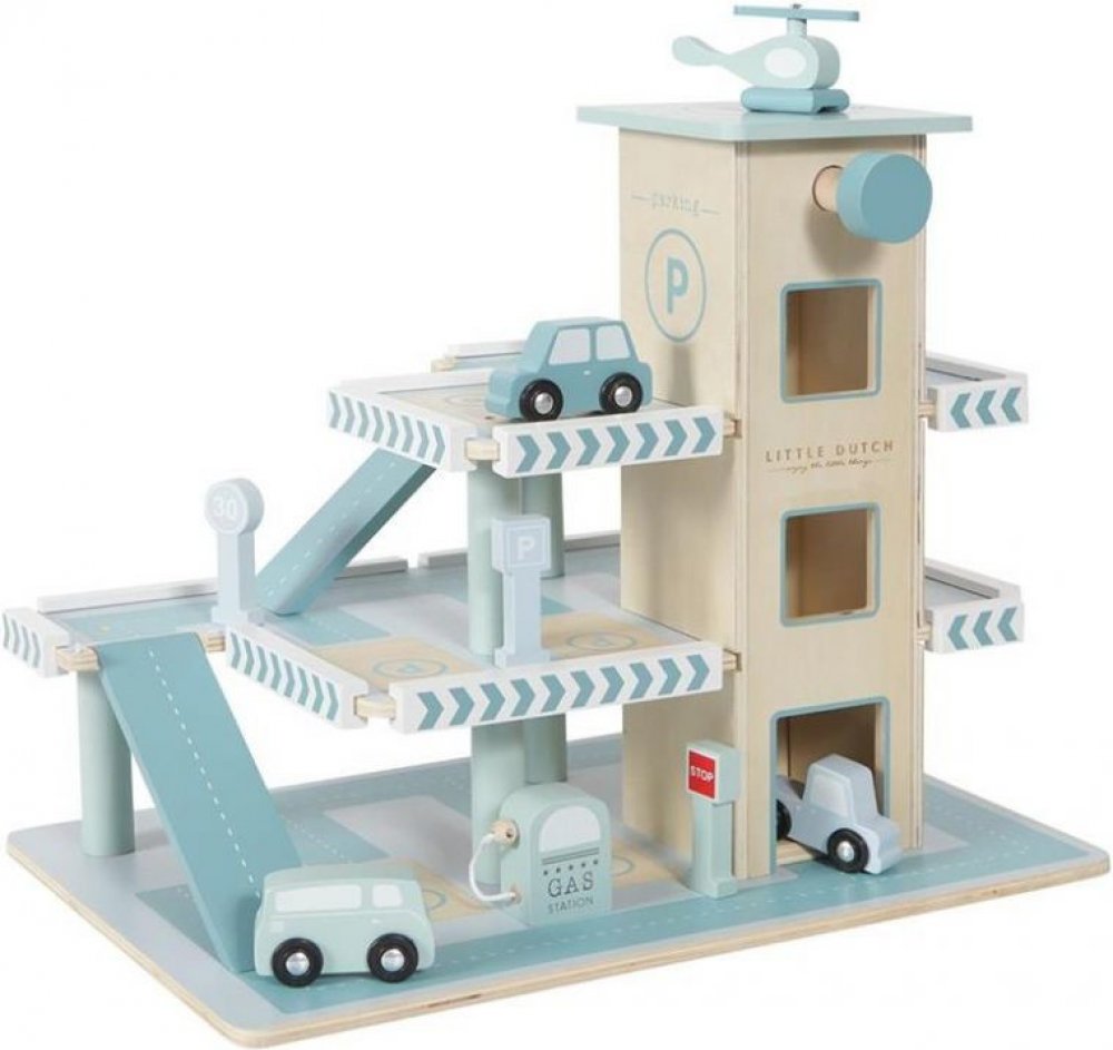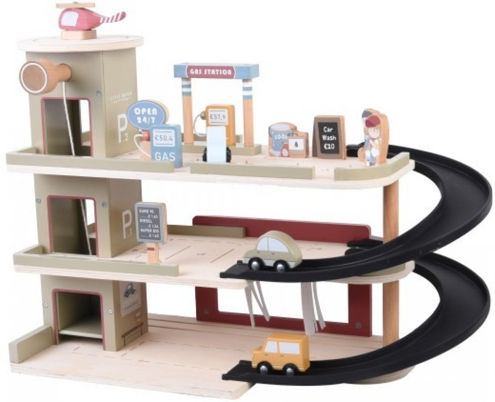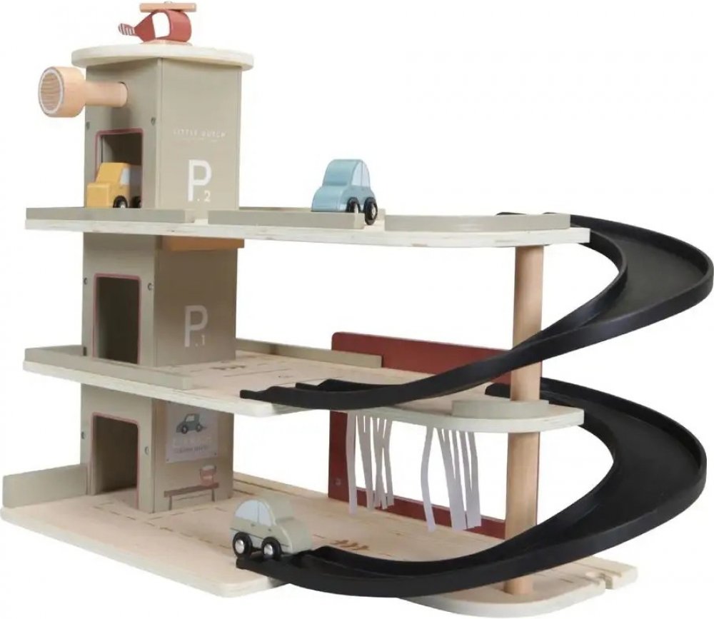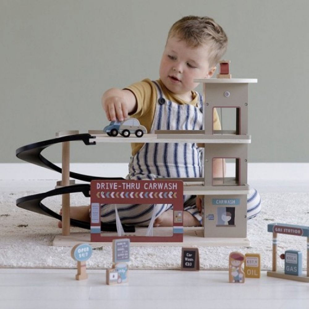 Dřevěná garáž je jednou z mnoha herních sad, které lze připojit k dřevěné Little Dutch Vláčkodráze XXL.