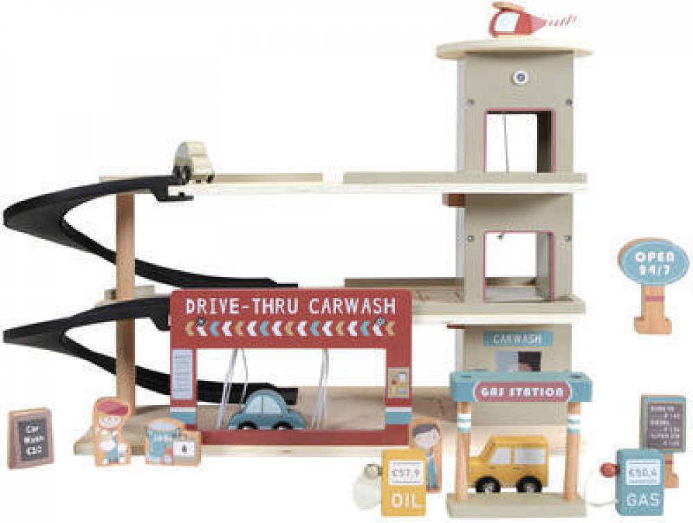 14-dílná sada obsahuje garáž s myčkou, auta, vrtulník, čerpací stanici, pumpy, značky a figurky zaměstnanců.