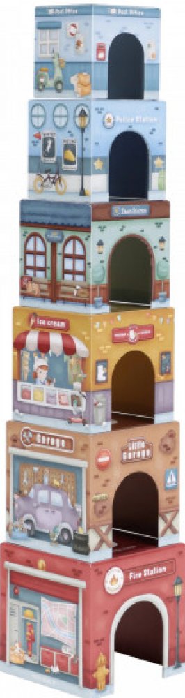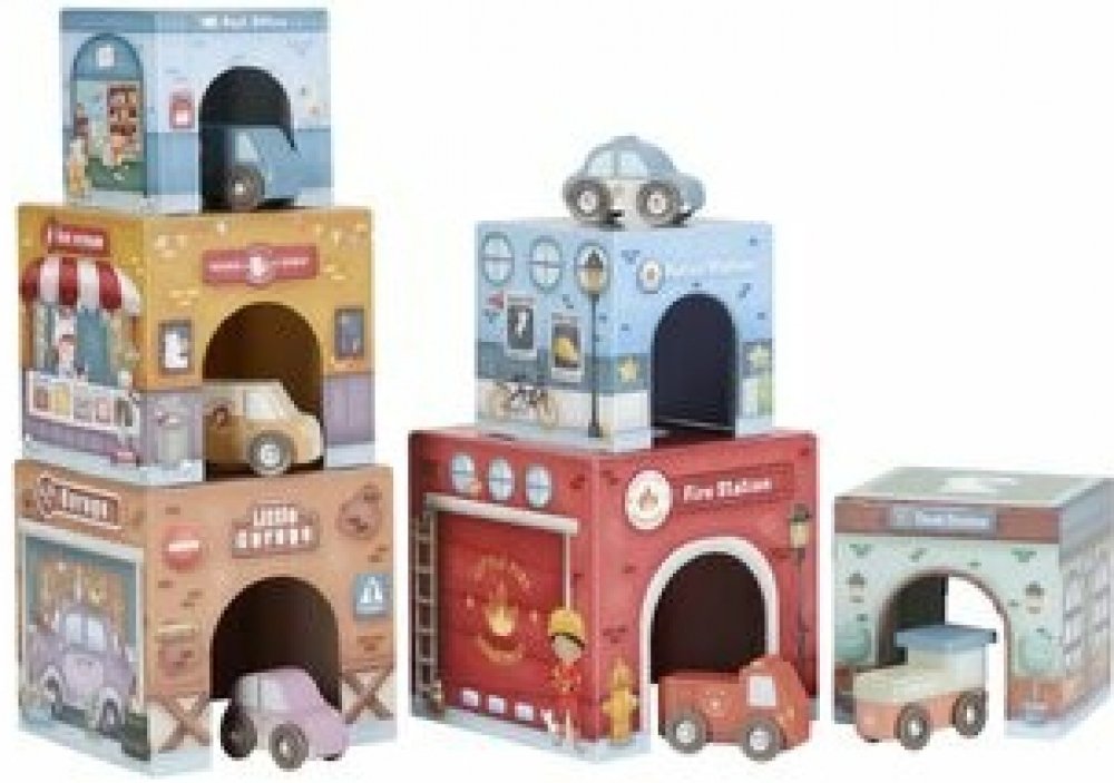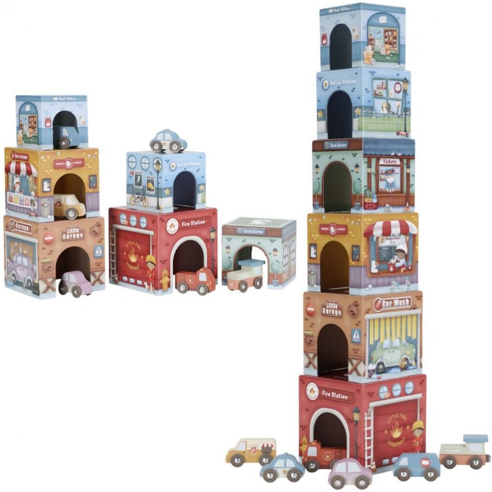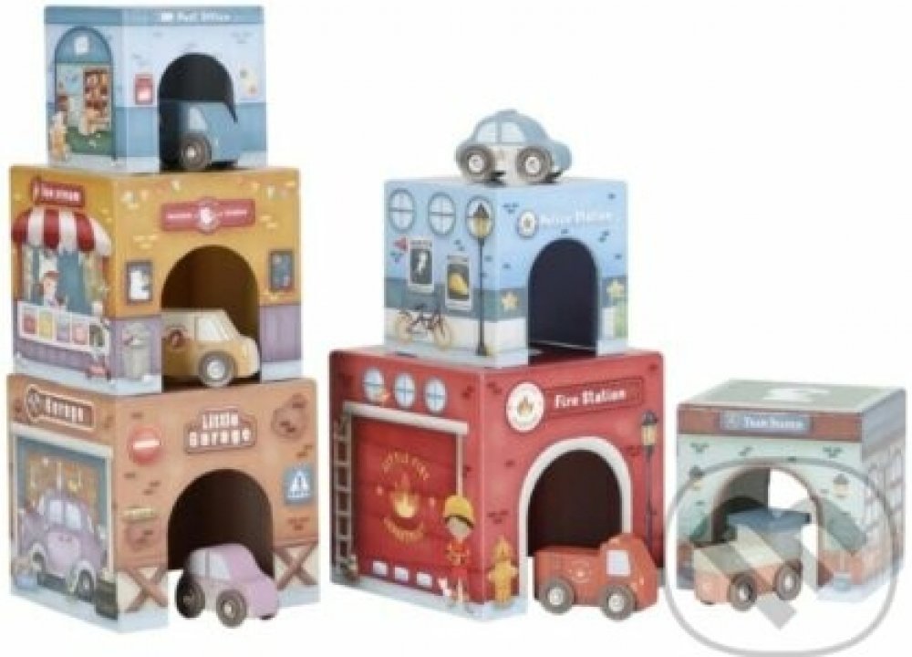 Stavět, objevovat a hrát si! Tato nápaditá sada Little Duch obsahuje šest ilustrovaných kartonových kostek různých velikostí, které představují budovy jako požární stanici, garáž nebo poštu – a k nim 6 dřevěných vozidel, patřících k jednotlivým budovám.