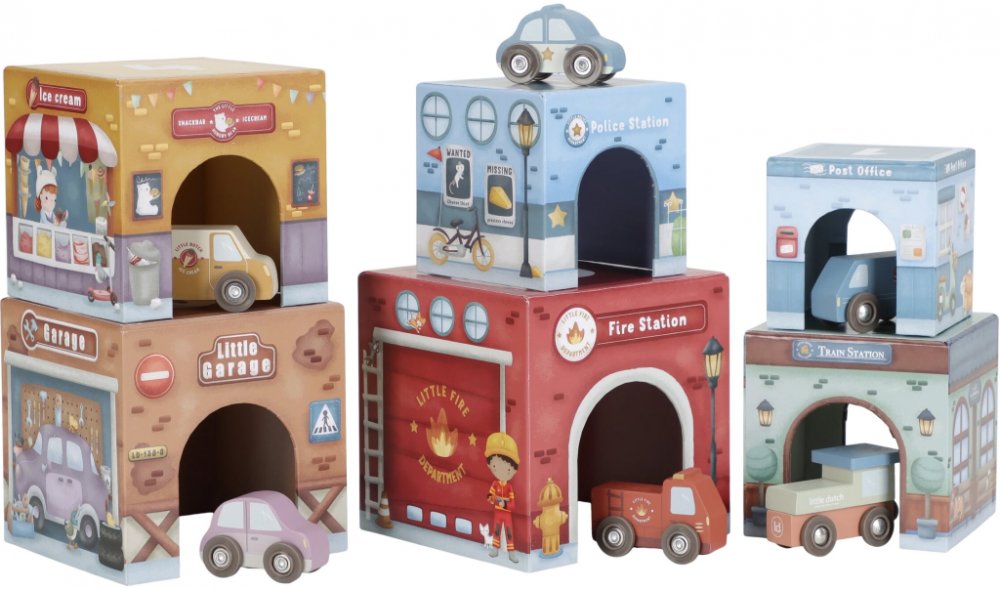 Děti mohou kostky stavět na sebe do vysoké věže i rozkládat je po podlaze a vytvářet celé městečko. Kostky lze skvěle kombinovat i s vláčkodráhou Little Dutch, kde vláček i autíčka pohodlně projedou pod kostkami jako pod mosty. Každá kostka má jinou ilustraci, která podporuje rozvoj fantazie, a každé vozidlo má své vlastní parkovací místo.