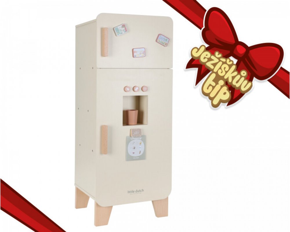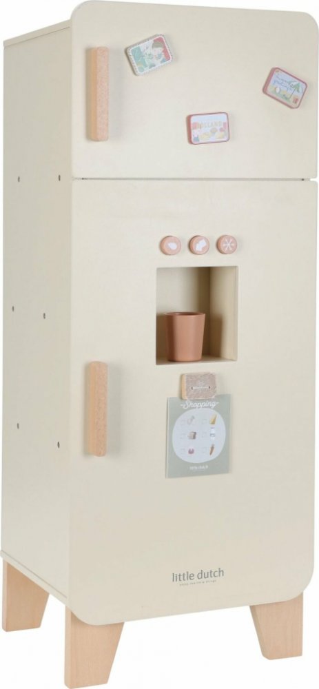 Krásná dřevěná lednice Little Dutch s mrazákem a výrobníkem ledu bude skvělým doplňkem dětské herní kuchyně, obchodu i restaurace. Lednice nabízí dostatek prostoru pro uložení potravin a obsahuje i speciální přihrádku na vajíčka. Díky praktickému rozvržení vnitřního prostoru a pohyblivým prvkům se děti zábavnou formou učí o skladování potravin a fungování domácnosti. Součástí balení je 19 doplňků, které se hodí pro uložení do lednice: máslo, sýr, 3 vejce, 2 kostky ledu, limonáda, džus, mléko, mražený ěpenát, 3 zmrzliny, kelímek, 3 magnety na lednici a nákupní seznam. Lednice je skvělým doplňkem k dětské kuchyňce a pračce z kolekce dřevěných hraček Little Dutch. Můžete tak vytvořit plně vybavenou herní kuchyň, kterou lze dále vybavit dalšími dřevěnými hračkami Little Dutch, např. kávovarem, toustovačem, kuchyňskou váhou, krájecím ovocem, krájecí zeleninou, čajovým servisem apod. Děti se učí napodobováním svých rodičů a zároveň taková hra rozvíjí kreativitu, soustředění, jemnou motoriku a sociální dovednosti. Vyrobeno z odolného FSC certifikovaného dřeva. Rozměry: 85 × 34 × 32 cm Vhodné pro děti od 3 let.