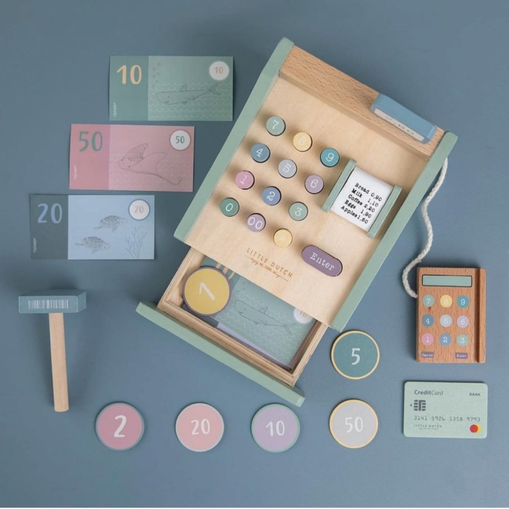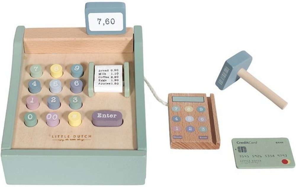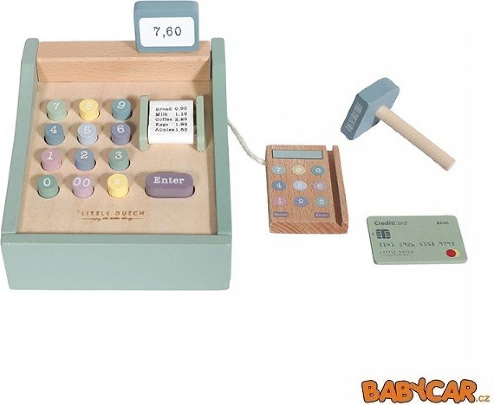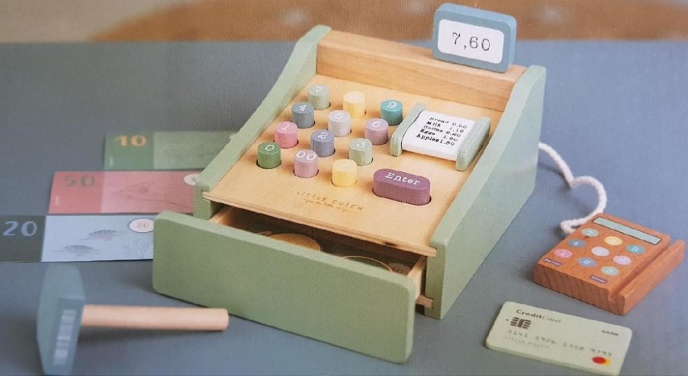 Bez pokladny nemůže fungovat žádný dětský obchod. Pokladna v krásném dřevěném provedení obsahuje skener, číslovaná tlačítka, bankovky a mince, zásuvku na peníze, platební terminál a platební kartu. Hra s rodiči, kamarády nebo oblíbenou panenkou může začít.
