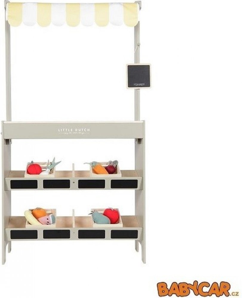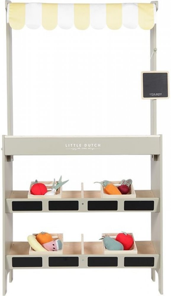 Balení neobsahuje dřevěné potraviny. Stánek lze doplnit o samostatně prodávanou dřevěnou pokladnu, stojan s cukrovinkami, krájecí zeleninu a ovoce a pod.