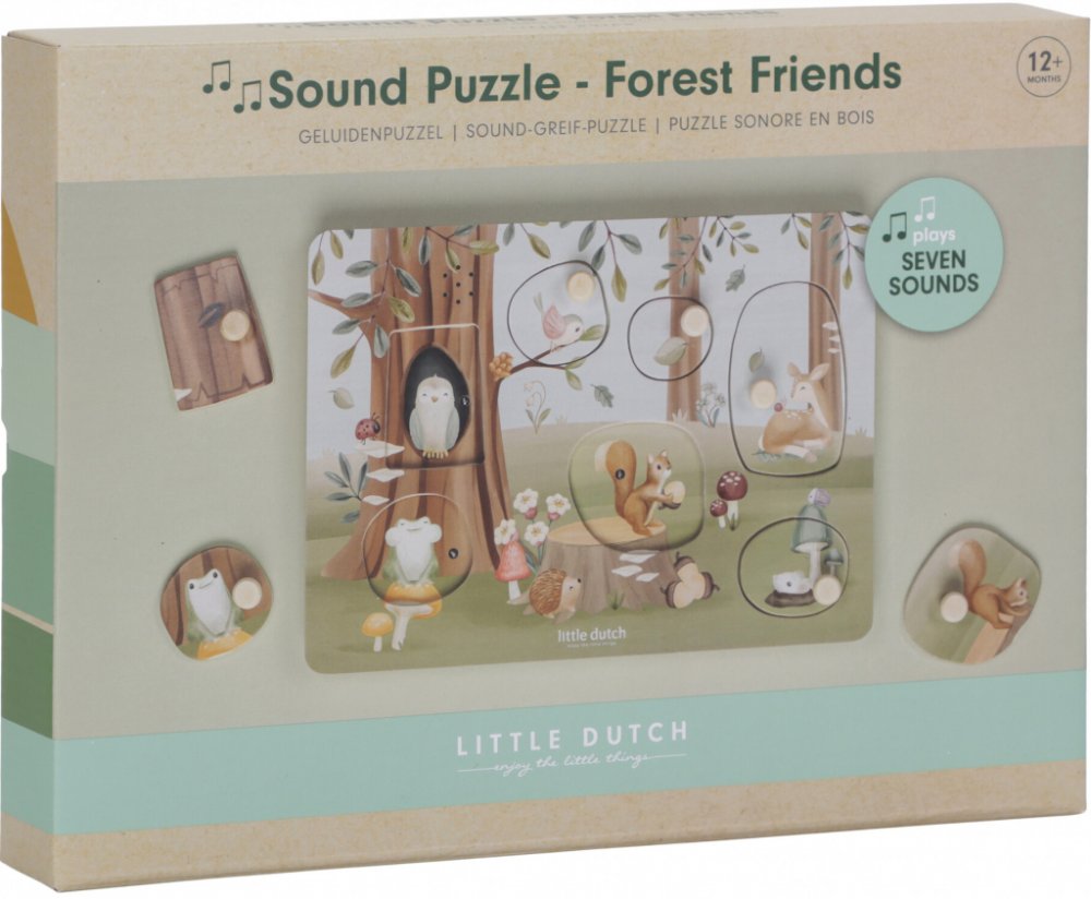 Puzzle hra v dřevěném provedení s překrásnými obrázky z lesního prostředí nabízí 7 různých vkládacích dílů, které po vložení na správné místo vydávají zvuk. Děti mohou slyšet například hlas ptáčka, což podpoří jejich touhu po dalším a dalším vkládání. Užijte si společné chvilky s roztomilými zvířátky nebo naopak nechte svoje děti, ať se chvilku zabaví samy.