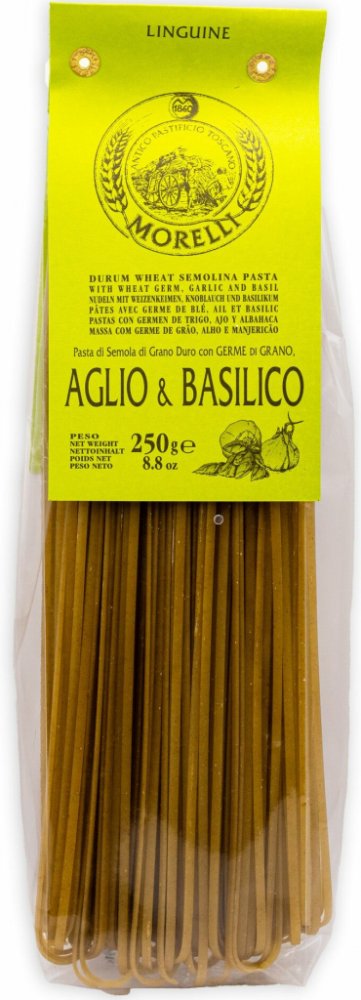 Linguine jsou „ploché špagety“, které díky větší kontaktní ploše navážou omáčku lépe než kulaté tvary. V této aromatické variantě se k semolině přidává bazalka a česnek, takže i jednoduchá kombinace s olivovým olejem, parmezánem a špetkou pepře vykouzlí plnohodnotný, voňavý talíř. Skvěle fungují s rajčaty, pestem, zeleninou i mořskými plody.