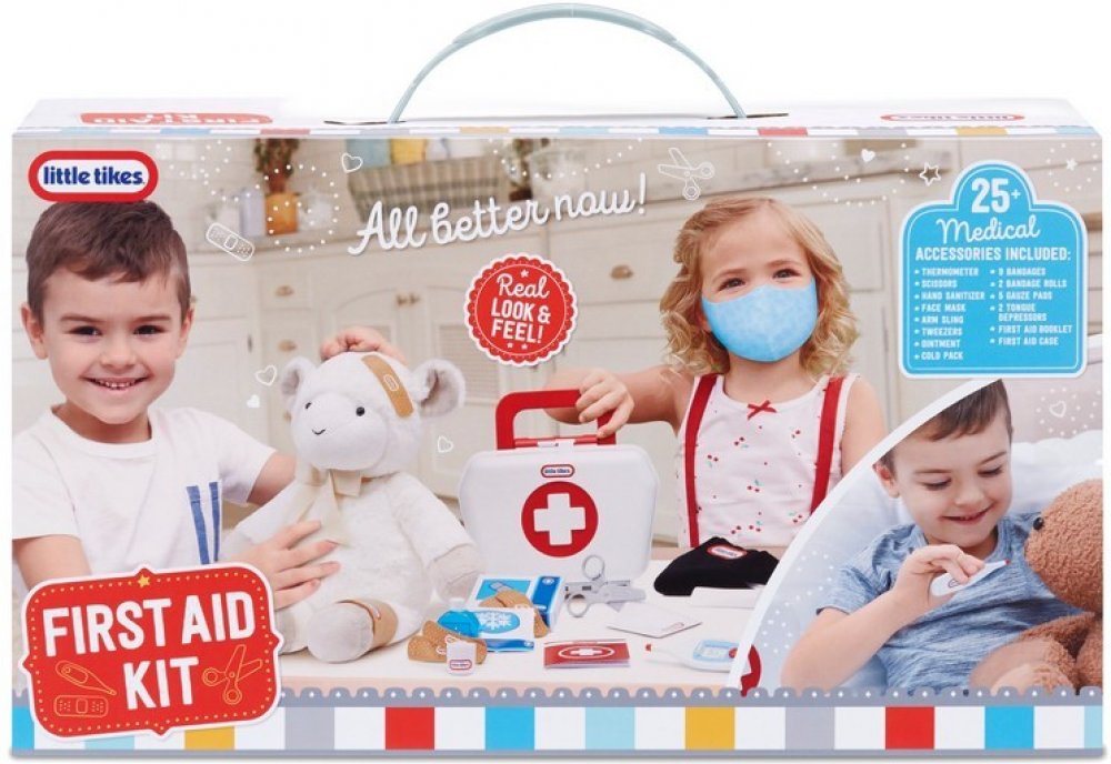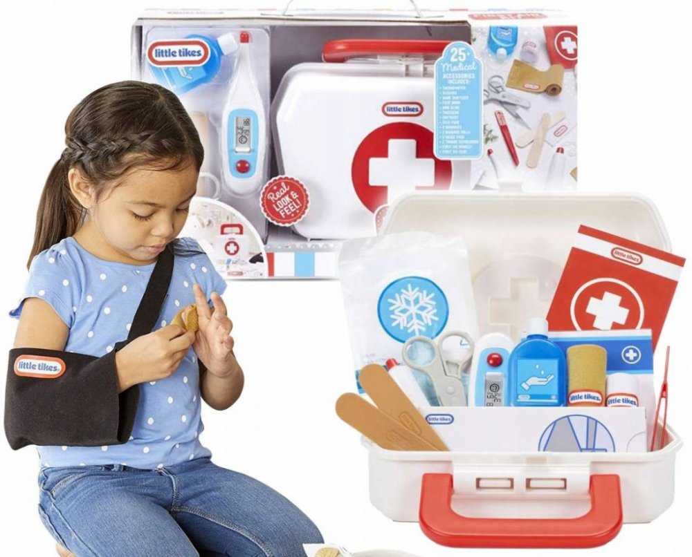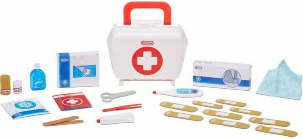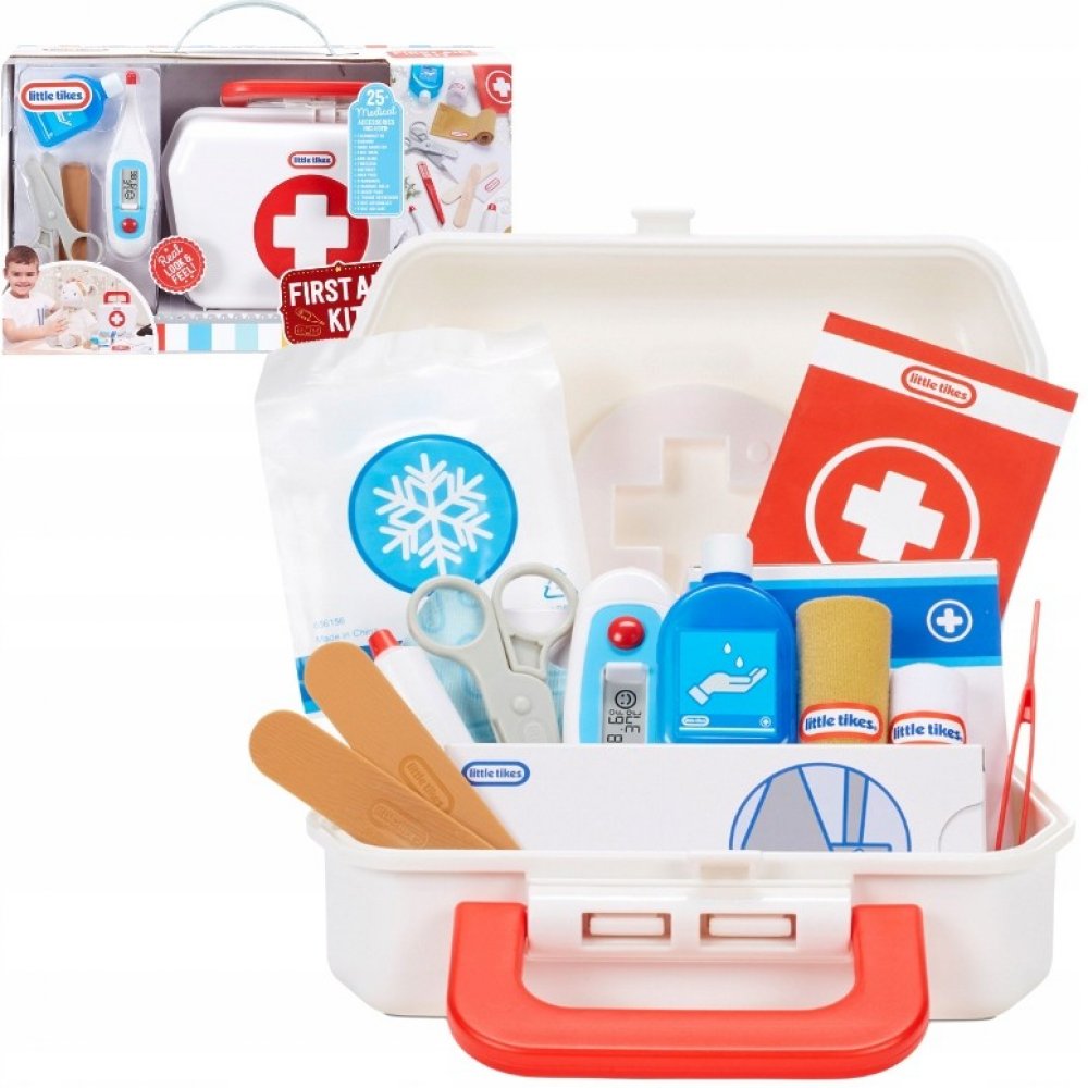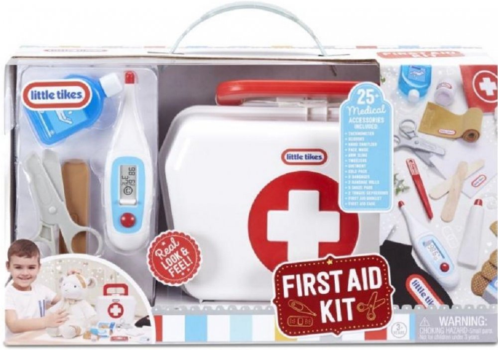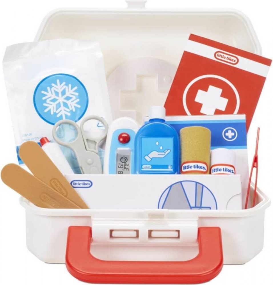 Little Tikes Moje první lékárnička je interaktivní hračka navržená tak, aby vypadala realisticky, takže děti mohou předstírat, že poskytují první pomoc. Bavte se přiložením gázy s obvazy na řezy a škrábance. Předstírejte, že někomu změříte teplotu pomocí interaktivního teploměru. Omotejte podvrtnutí obvazem a zajistěte ho suchými zipy. K uložení příslušenství používejte kufřík. Zahrnuje 25 lékařských doplňků, jako je obličejová maska, dezinfekční prostředek na ruce, prak na rameno, tuba na mast, brožura první pomoci, pinzeta, nůžky, studený zábal, špachtle do krku na jazyk a další!