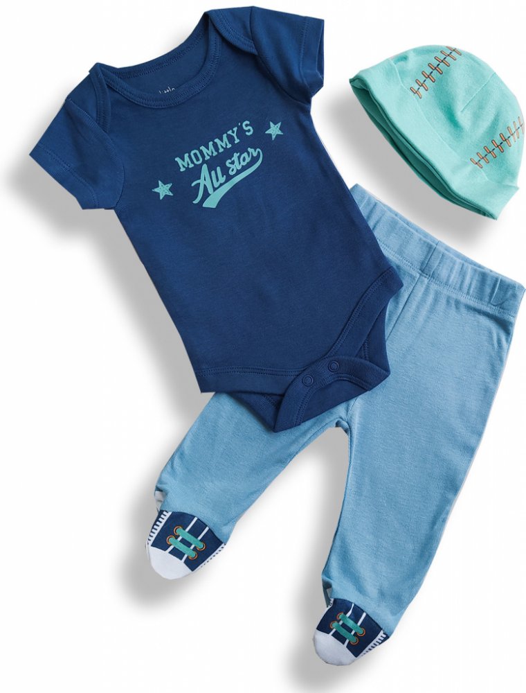 Krásný třídílný kojenecký komplet s motivem baseballu: Kojenecké body, tepláky s capáčky, čepička.