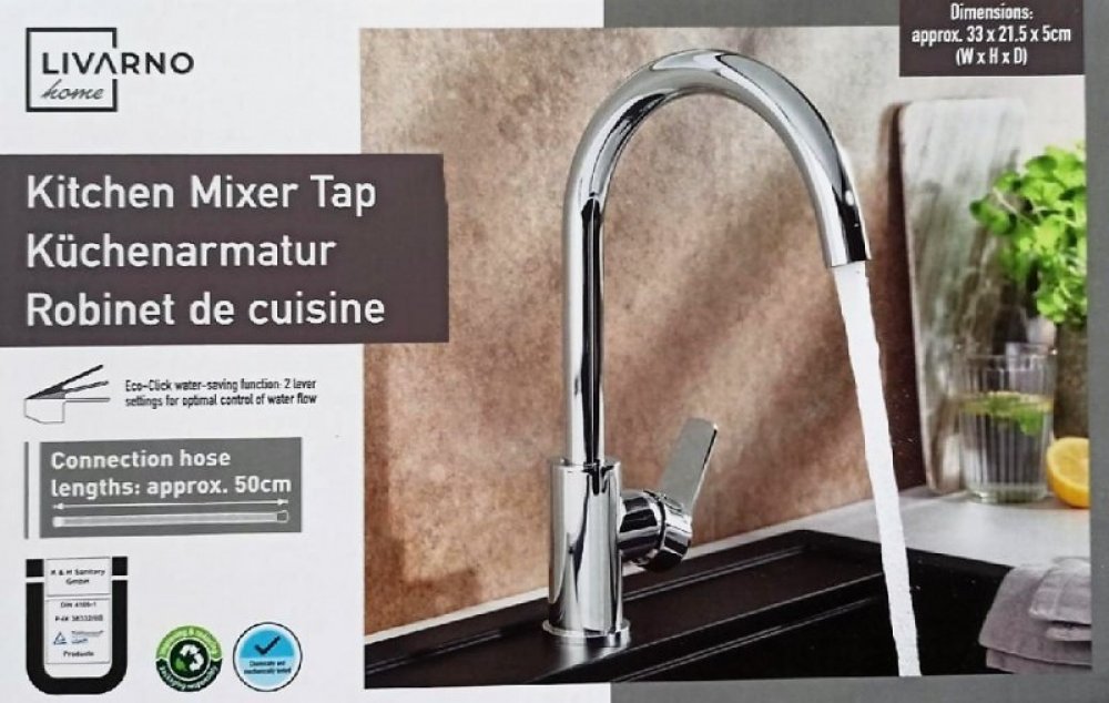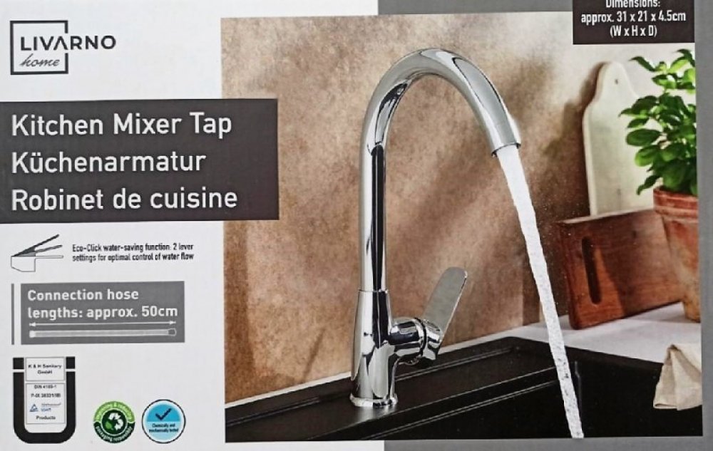 LIVARNO home Kuchyňská baterie Vyrobena z mosazi podle aktuálního nařízení pro pitnou vodu Funkce úspory vody Eco-Click: 2stupňově nastavitelná páka pro optimální regulaci množství vody Funkce šetření energie: ve střední poloze teče jen studená voda Maximální teplota nastavitelná pomocí kartuše Výtok otočný o 360° Jednoduchá instalace do 1 otvoru s rychlým připevněním dříku (Shaftfix) - včetně montážního materiálu a návodu k montáži Tichá, vyměnitelná 35mm kartuše s keramickou destičkou s nízkým opotřebením Zpětný ventil Vhodná pro všechny běžné kuchyňské dřezy Včetně 2 flexibilních připojovacích hadic z ušlechtilé oceli Příslušenství Pružné kovové přípojné hadice 500 mm (barevně odlišené, modrá = studená voda, červená = teplá voda) 1x klíč na vnitřní šestihran 1x svorka (Shaftfix) 1x závitová tyč 1x umělohmotná matka 1x těsnění 1x kovová podložka Materiál Mosaz, chrom, POM, silikon, keramika, kov, ušlechtilá ocel Rozměry Obdélníkové provedení: cca 310 x 210 x 45 mm Kulaté provedení: cca 330 x 210 x 50 mm Délka připojovacích hadic: cca 50 cm Hmotnost Obdélníkové provedení: cca 870 g Kulaté provedení: cca 900 g