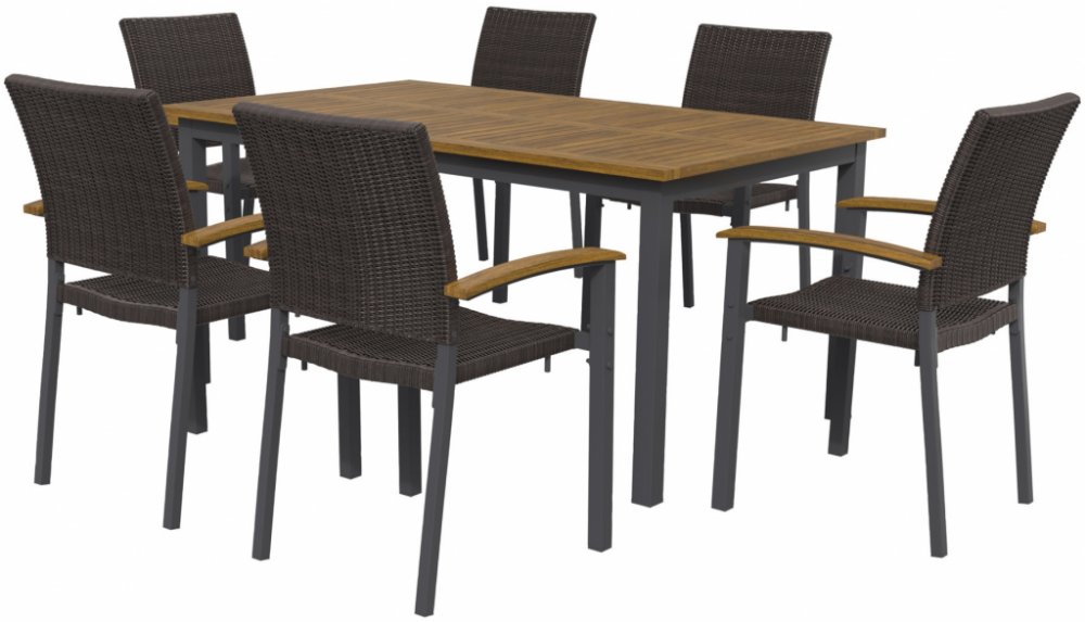 Livarno Home Sada hliníkového zahradního nábytku s židlemi Valencia, 7dílná; hnědá Hliníkový zahradní stůl Valencia, 150 x 90 cm, hnědá Livarno home Hliníkový zahradní stůl Valencia, 150 x 90 cm, hnědá Dlouhá životnost a snadná údržba Deska stolu z impregnovaného tvrdého dřeva Hliníkový rám s práškovým nástřikem Lepší stabilita a vyrovnání nerovností povrchu do 8 mm pomocí vysouvatelných nožiček I...