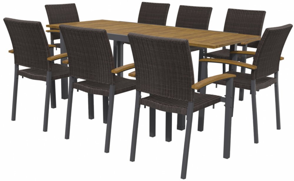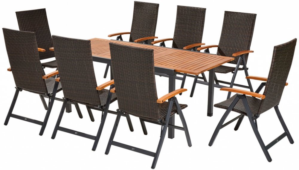 Livarno Home Sada hliníkového zahradního nábytku s rozkládacím stolem a židlemi Valencia, 9dílná; hnědá Hliníkový zahradní rozkládací stůl Valencia, 150–200 x 90 cm, hnědá Livarno home Hliníkový rozkládací stůl Valencia, 150–200 x 90 cm, hnědá Rychlé a snadné vytažení v rozsahu cca 150–200 cm Dlouhá životnost a snadná péče Deska stolu z impregnovaného tvrdého dřeva Rám z hliníku s práškovým lakováním 1 noha s výškovým vyrovnáním do 8 mm pro stabilní polohu Ideální v kombinaci s dalším nábytkem značky Livarno home Protiskluzové profilové nohy šetrné k podlaze Odolný proti vlivům počasí a UV záření Eukylyptové dřevo s certifikací FSC Max. nosnost: cca 60 kg Barva: hnědá Rozměry cca 150–200 x 74 x 90 cm (Š x V x H) Hmotnost cca 20 kg Stohovatelná židle Valencia, hnědá Livarno home Stohovatelná židle Valencia, hnědá Vhodná na balkon, terasu nebo do zahrady Hliníkový rám s práškovým nástřikem Oboustranný výplet z umělého ratanu Opěrky z impregnovaného tvrdého dřeva (eukalyptus s certifikátem Fsc) Nohy s ochrannými krytkami Stohovatelná Odolná proti UV záření a vlivům počasí Max. nosnost: cca 110 kg Barva: hnědá Materiál Rám: hliník Výplet: polyetylen Područky: pravé dřevo (eukalyptus) Šrouby: nerezová ocel Rozměry cca 56 x 90 x 58 cm (Š x V x D) Přední nohy: cca 3,5 x 3,5 cm Zadní nohy: cca 2,5 x 2,5 cm Šířka područky: cca 5 cm Hmotnost cca 3,9 kg