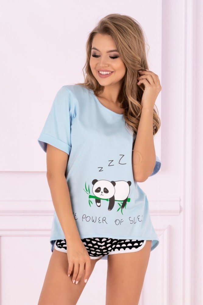 Sexy krátké dvoudílné pyžamo Panda pro ženy a dívky. Na světle modré halence potisk pandy spící na bambusu. Zadní díl trička je v prodloužené délce. Spodní díl krátké černé šortky s bílými půl-puntíky.Pohodlné a příjemné. Skvělý doplněk k večernímu odpočinku pro všechny ženy, které se mají rády. Materiálové složení: 100% bavlna - Dámské pyžamo Panda levně