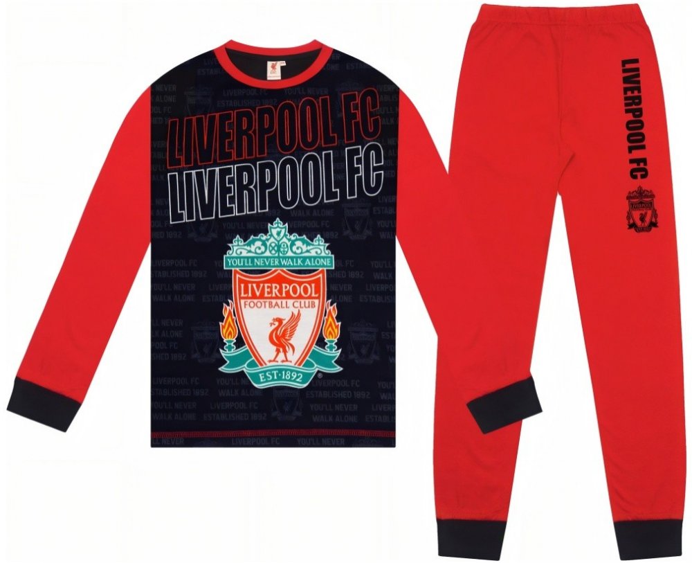 Dětské pyžamo Liverpool FC v červené a černé barvě. Dlouhý rukáv i nohavice. Barevný znak zepředu. Elastické zakončení rukávů a nohavic. Nápis LIVERPOOL FC a klubový znak na nohavici. Prvotřídní materiál.