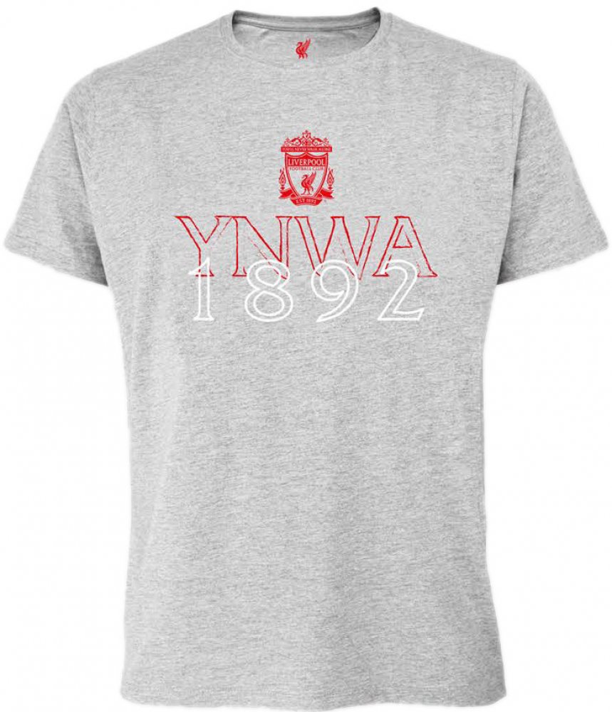 Tričko Liverpool FC v šedé barvě. Červený a bílý nápis YNWA 1892 zepředu. Klasický střih. Prvotřídní bavlna.