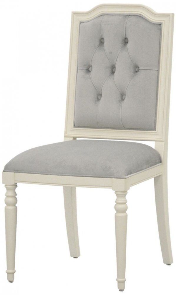 Čalounění ze sametové látky v šedém odstínu krásně kontrastuje se světle krémovým rámem. Jemný lesk materiálu podtrhuje luxusní charakter židle a působí mimořádně příjemně na dotek. Prošívání na opěráku dodává židli hloubku a noblesní vzhled, který se dokonale hodí do interiérů v provensálském, rustikálním nebo romantickém stylu.