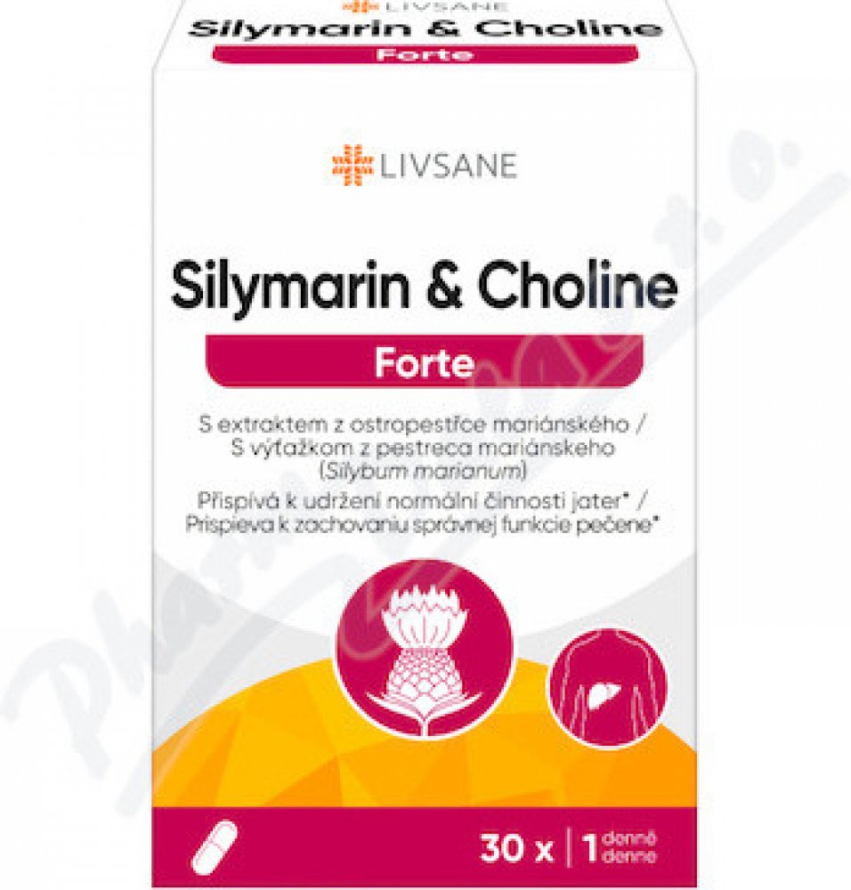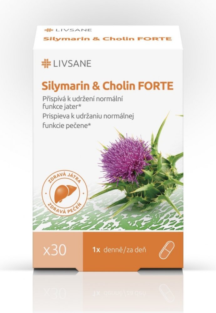 LIVSANE Silymarin a cholin Forte je doplněk stravy, který obsahuje v jedné tobolce 200 mg silymarinu a 82,5 mg cholinu. Silymarin je směs rostlinných látek vyskytujících se v plodu ostropestřce mariánského. Cholin přispívá k udržení normální funkce jater. Přirozeně se vyskytuje v některých potravinách, například ve vaječných žloutcích, játrech, v luštěninách (sója), obilných klíčcích, kvasnicích, ...