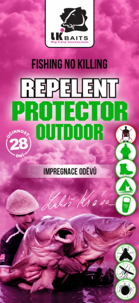 Protector outdoor - impregnace oděvů s přírodní aroma. Absolutní novinka na trhu pro rybáře, myslivce a všechny, kteří milují nerušený pobyt v přírodě. Nová generace ochrany před nepříjemným a nebezpečným hmyzem jako jsou komáři a klíšťata. Insekticidní repelent určený k impregnaci oděvů, obuvi, bivaků, spacáků, moskytiér apod.