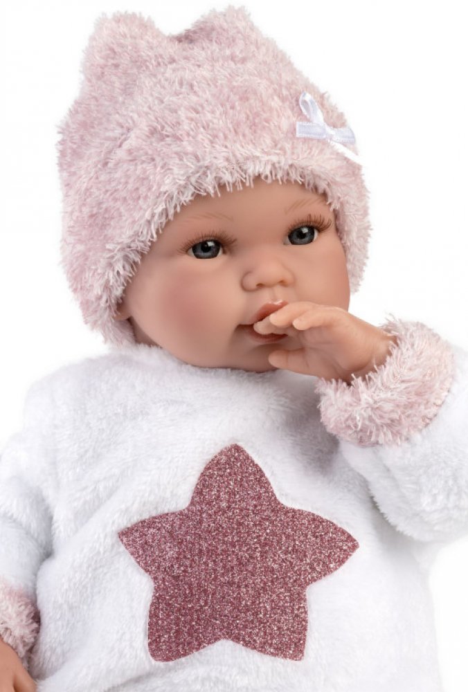 Mluvící miminko s měkkým látkovým tělem, které po zatlačení na hrudník začne říkat „mama“, „papa“ a vydávat reálný zvuk plačícího miminka.
