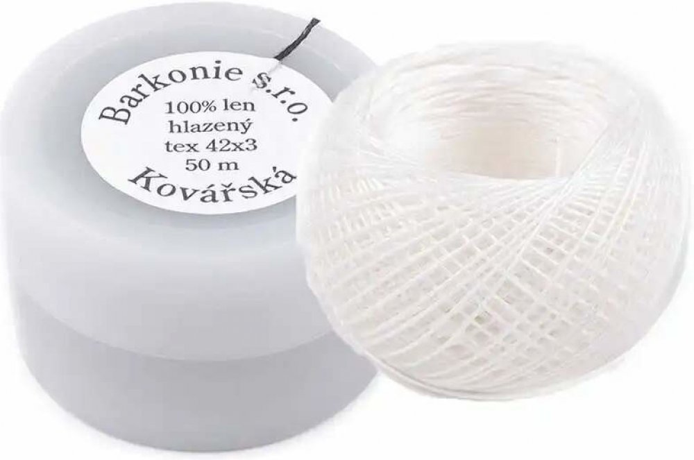 100% lněná leštěná (hlazená) nit o jemnosti 42 tex 3 (NeL 39,7/3, Nm 24/3) s návinem 50 m, navinutá ve formátu klubíčka o průměru cca 4 cm.