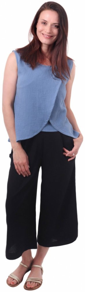 Dámské kalhoty ve střihu cullotes- velmi lehké vzdušné- top letní produkt- působí velmi žensky a elegantně, krásně padnou- v pase v zadní části široká měkká guma, která při natažení poholdně zvětšuje obvod pasu o 4cm- přední část pasu je hladká, zapínání na kovové cvočky- ve zkrácené délce- na vyšších ženách působí jako 3/4 kalhoty, na menší postavě jako 7/8, obě verze vypadají krásně