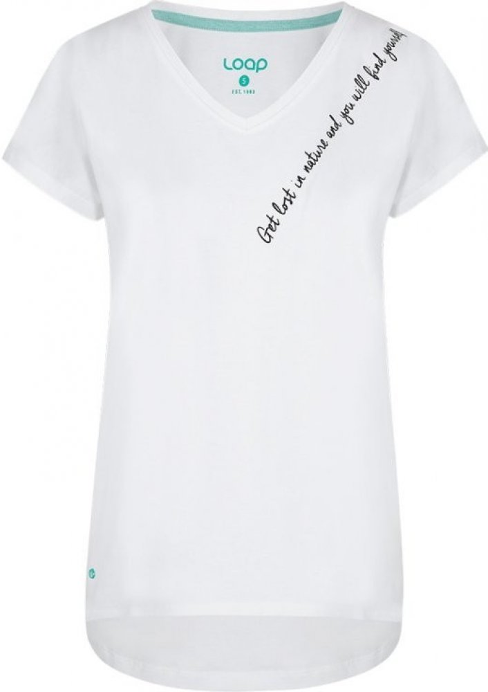 Loap Abaka dámské tričko bílé Materiál je díky bavlně příjemný na těle a elastan zajišťuje pružnost. Triko má prodloužený zadní díl. Dámské triko Loap Abaka je šité ve střihu Comfort Fit. Tento střih je volnější a pohodlný. Triko je vyrobeno ze bavlny, díky které je příjemné na těle a elastanu, který dodává materiálu pružnost. Kombinace materiálů zaručuje vysoký komfort, snadno se udržuje, nemačká se a drží tvar. Triko má výstřih do „V“, raglánové rukávy a prodloužený zadní díl. Celý vzhled doplňuje potisk drobným textem a nenápadné detaily s logem Loap. Gramáž materiálu je střední, činí 170 g/m2. Triko Abaka má univerzální využití. Je vhodné na každodenní nošení od jara do podzimu. Modelka je vysoká 170 cm a má na sobě velikost S. Materiál: 95 % Bavlna, 5 % Elastan Hlavní přednosti: Comfort Fit 170 g/m2, příjemný materiál, vysoký komfort, volnost pohybu, univerzální využití, jednoduchá péče