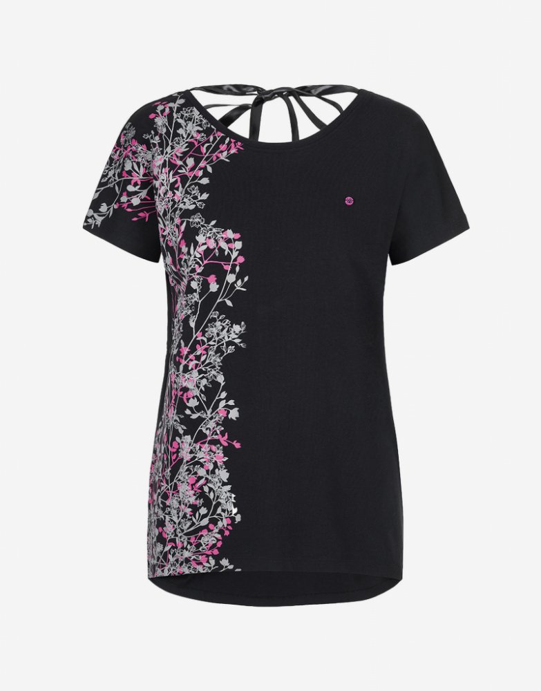 Dámské triko ABONA s minirukávem má pohodlný volnější střih (Comfort Fit) s kulatým výstřihem vpředu a véčkovým výstřihem vzadu, který má navíc zavazování na růžovou mašli. Spodní okraj je rovný s mírně prodlouženým zadním dílem. Toto bavlněné triko je díky příměsi elastanu (5 %) pružnější a přiléhavější, méně se mačká. Vpředu má elegantní květinový vzor, který je sladěný s barvou loga a mašle. Se...